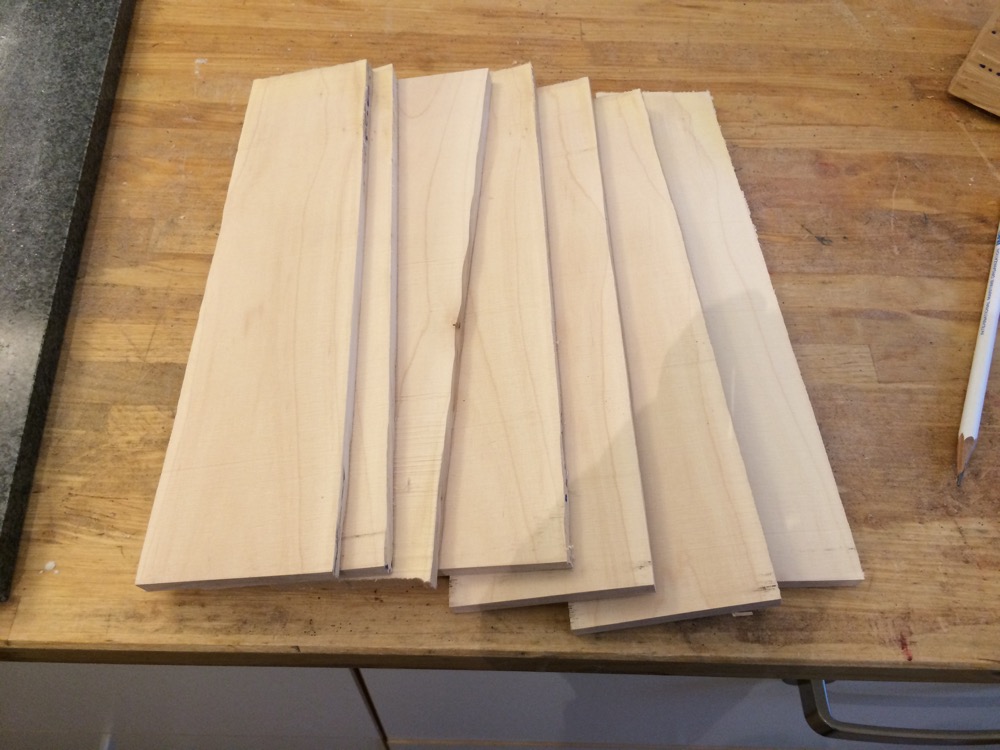 heute habe ich das Holz für die Tips gesägt. Es sind 8mm dicke/dünne Plättchen, die in den nächsten Arbeitsschritten noch gewässert, gekocht, auf Form gebogen und dann aufeinander laminiert werden müssen.