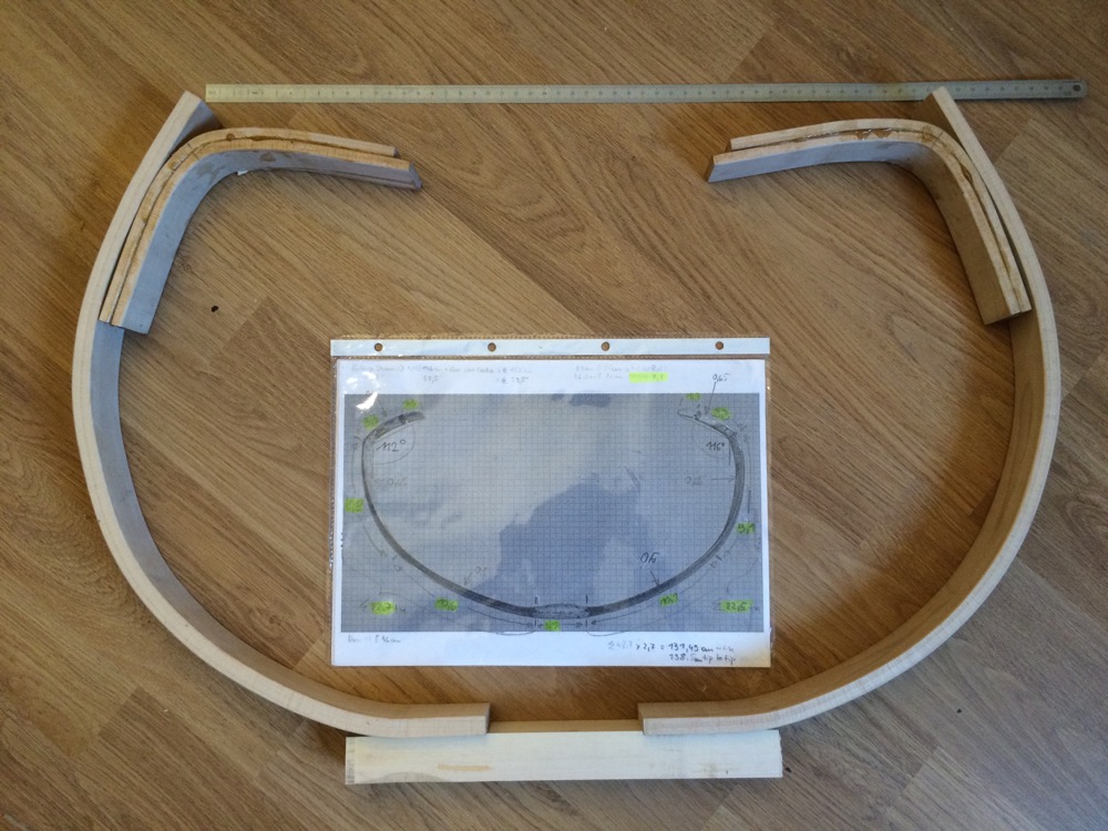 Und dann konnte es auch schon an die Biegeform gehen - oder besser gesagt, zwei Biegeformen: eine für die Wurfarme und dann nochmal für die stark gewinkelten Tips, die eingespleisst werden. Ich habe in die späteren biegenden Bereiche etwas mehr Reflex eingearbeitet, als der Originalbogen hergibt.