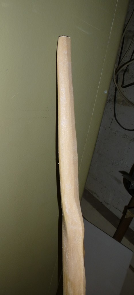 Das Profil ist linsenförmig und die Übergänge zum Griff und zu den Needles sind schon angelegt. Die Needles müssen noch deutlich dünner, aber ich hab ja noch ein wenig Zeit. Der Markkanal im Griff wird noch mit Holz gefüllt und ich überlege ob ich Holler vom gleichen Stamm nehme oder was Besonderes ... ich hätte noch Berberitze oder Robinie da ... doof ist nur, das der Kanal nicht mittig im Griff sitzt. Mal schauen. Zur Zeit 1030g.