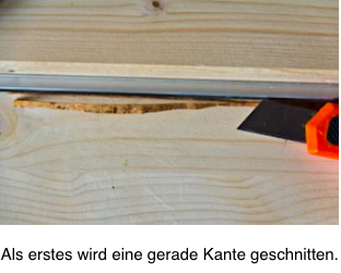 Die Rinde wird mit Hilfe eines Schneidelineals, dass zwischen zwei Bretter geklemmt ist, auf die notwendige Breite geschnitten.