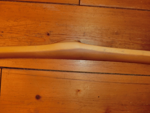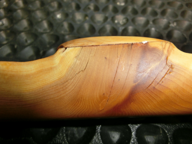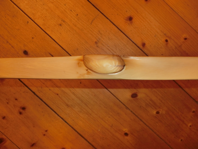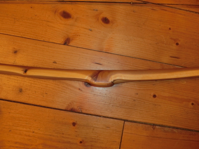 Genau Mitte Griffstück sitzt ein großer Ast, der lose war und eingeklebt worden ist (vom Bogenbauer).