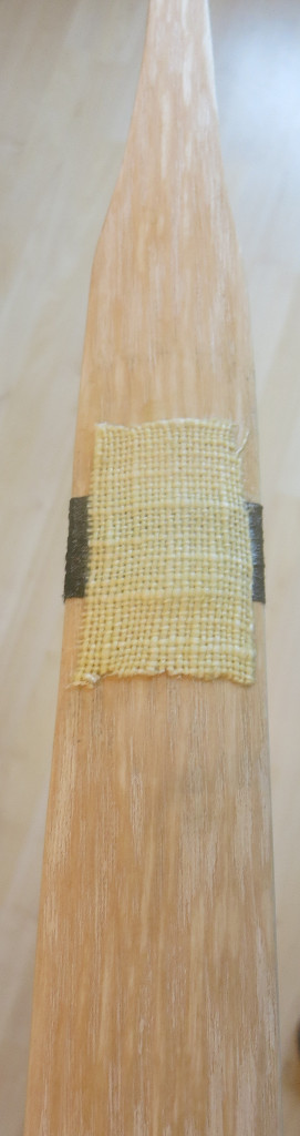 Ich habe den Riss mit erhitztem Uhu Endfest 300 gefüllt. Nach dem Trocknen habe ich um den Wurfarm herum mit Sternfaden eine Wicklung angebracht welche ich am Rücken ebenfalls mit erhitztem Endfest fixiert habe. Nach dem Trocknen habe ich ein Stück Leinen mit Weissleim darüber geklebt. Bis jetzt hält er