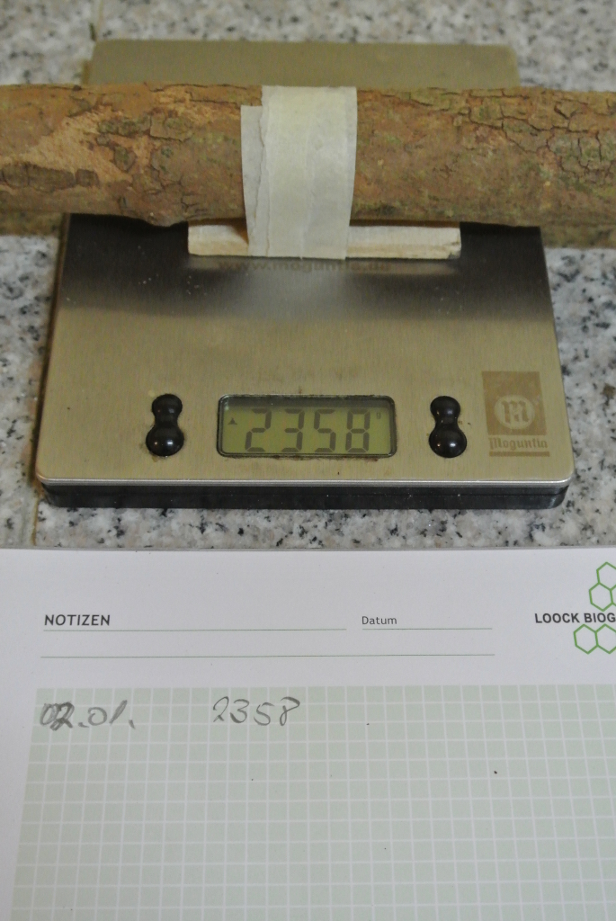 Der Gewichtsverlust ist ständig geringer geworden darum kommt jetzt die Rinde runter um das Trocknen wieder zu beschleunigen.