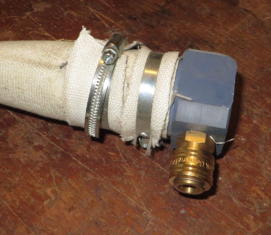 Am Kopf drehe ich mir ein 2" Stück und schneide darin ein Rohrgewinde rein , worauf eine Druckluftkupplung kommt. Die Fixierung ist am Schlauch mittels Draht und /oder Schlauchschellen.