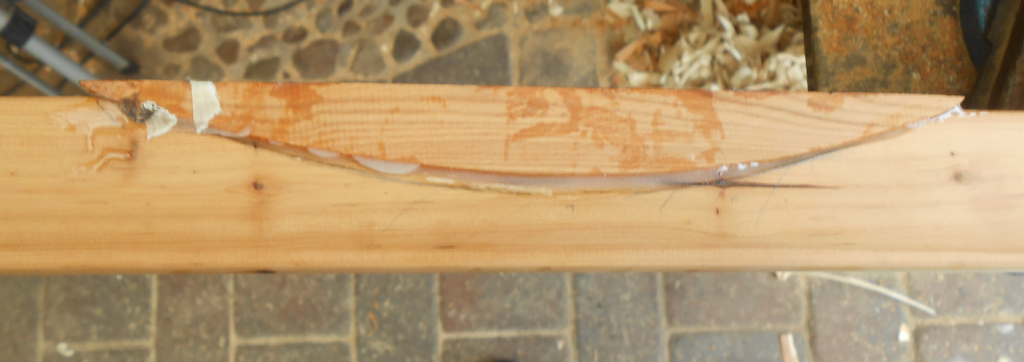 Wie ich schon geschrieben hatte, habe ich den Problembereich auf ca. 19 cm, bis knapp unterhalb des Backings und bis zur Bogenmitte, weggenommen und ein neues Stück Eibenkernholz eingepasst.Anschließend habe ich alles mit Endfest bestrichen und mit Klemmen und Zwingen gesichert. Den Wurfarm habe ich dabei wieder ein bißchen reflex gezogen, damit den Knick verschwindet (hoffentlich).Zum Trocknen bekam der Bogen dann einen schönen Platz an der Sonne,