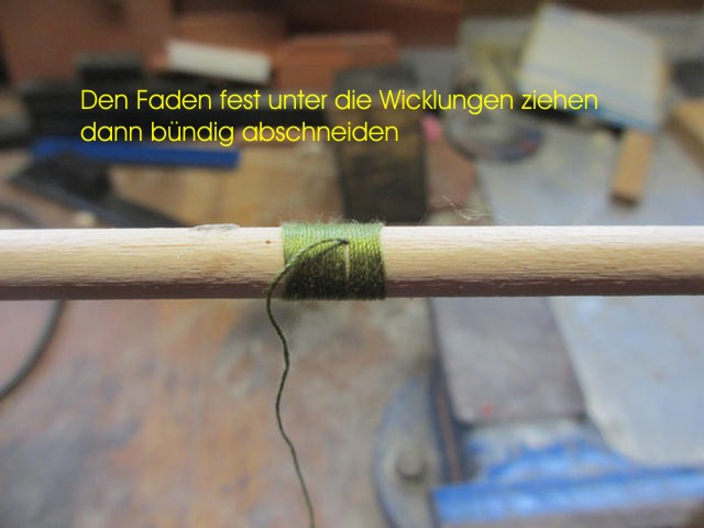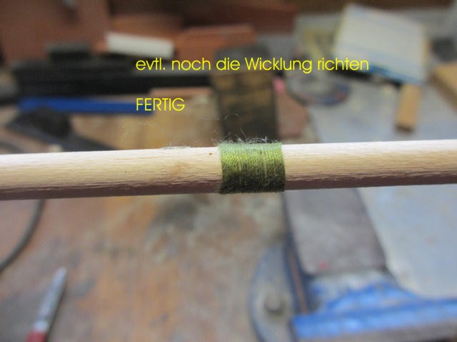 Damit sich der Faden bei diversen Zwischenhandgriffen nicht wieder vom Schaft abrollt, hänge ich dazu ein kleine Leimzwinge als Gewicht an den Faden. Das reicht um die Spannung zu halten.