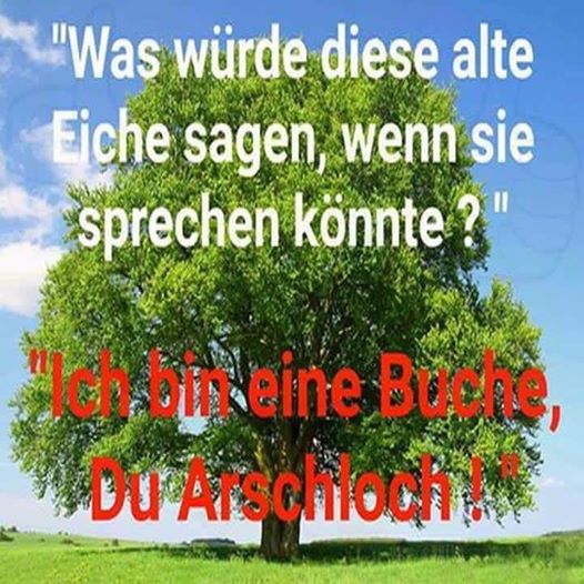 Naja der Baum beleidigt ja den Menschen der ja zuvor den Baum nicht richtig bestimmt hat also wird wohl ein gebildeter Baum wissen das ein Mensch anatomisch gesehen sehr wohl ein Arschloch hat und nicht nur Astlöcher