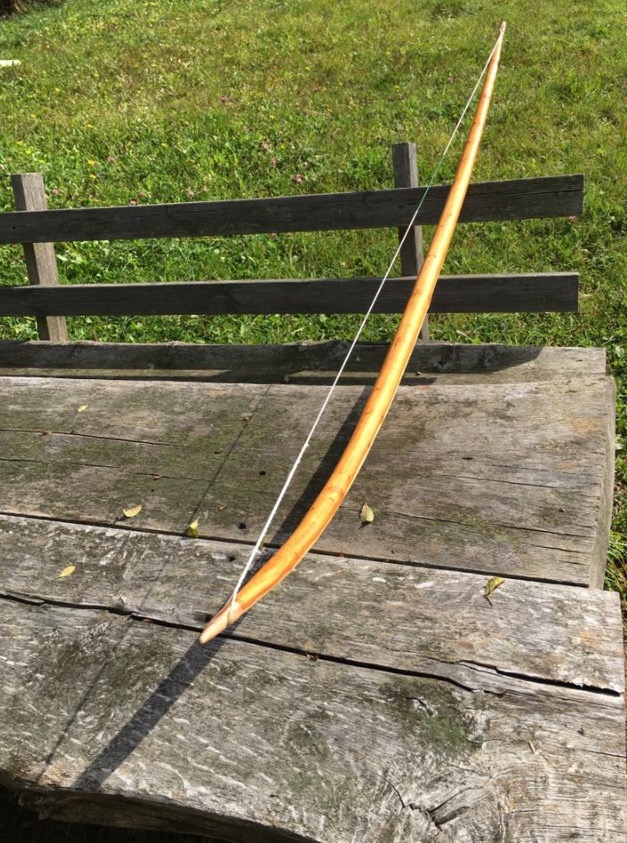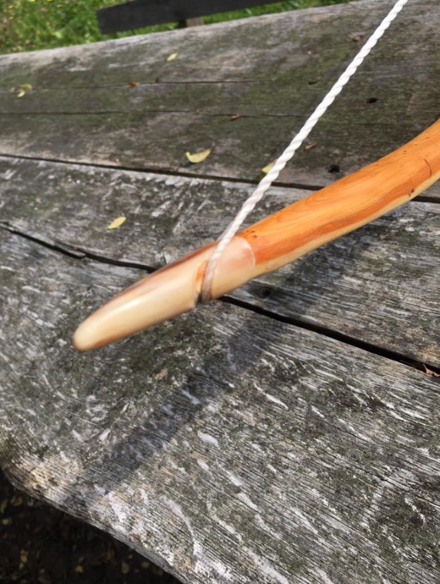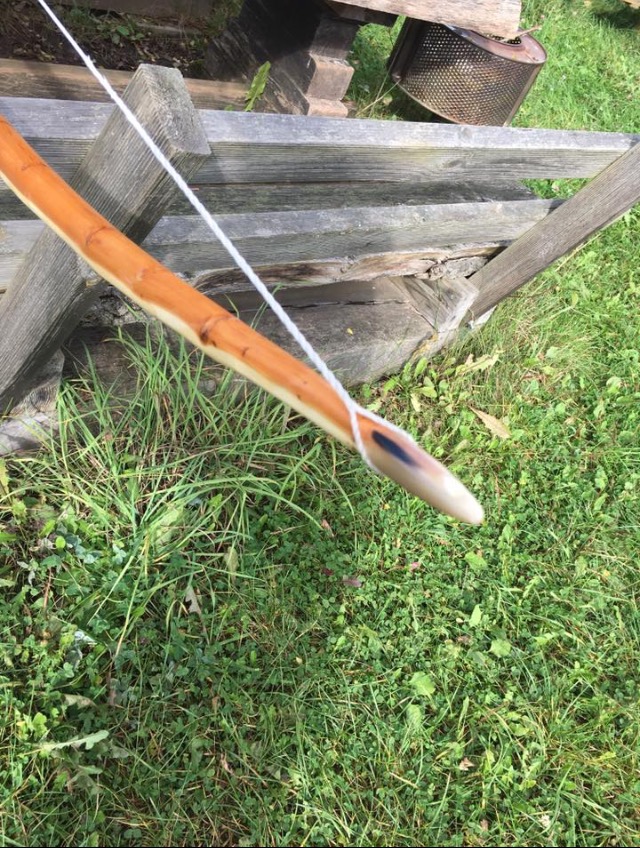 "Luigi" ist ein 75" langer Eiben-Italiener mit etwa 110 Pfund bei 32" Auszug, 37mm breit und 32mm tief im Griffbereich, 12mm rund an den transparent-blonden Sidenocks aus Kuhhorn.