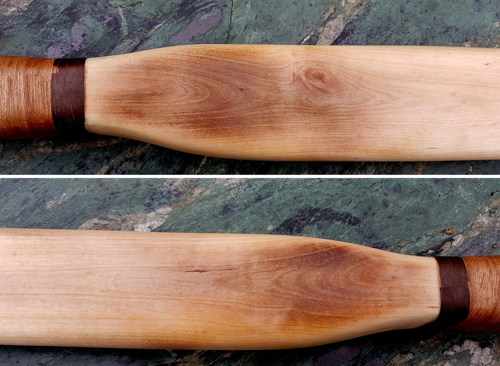 nochmal der Griffbereich mit Wicklung aus selbst geschnittenem Bergulme- und Schwarznussfurnier