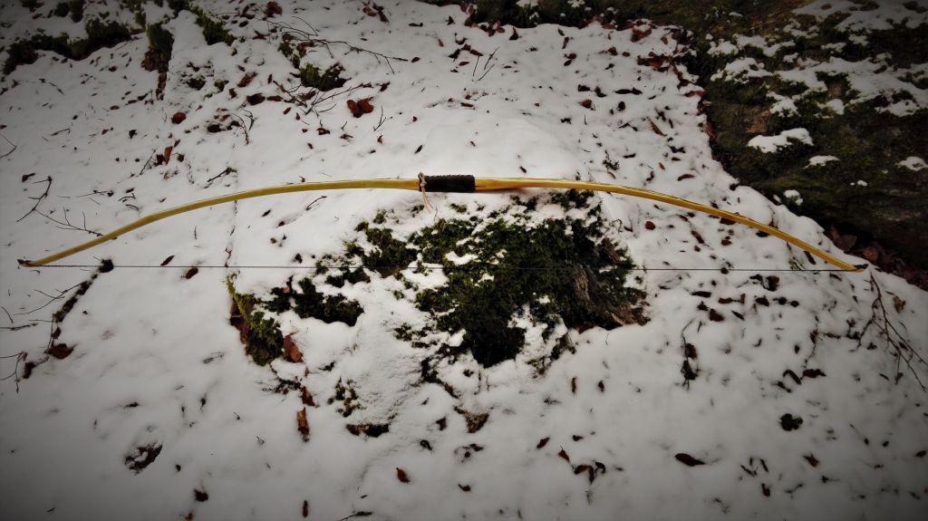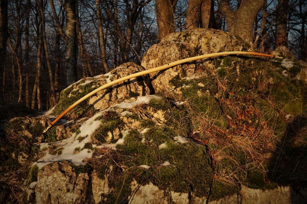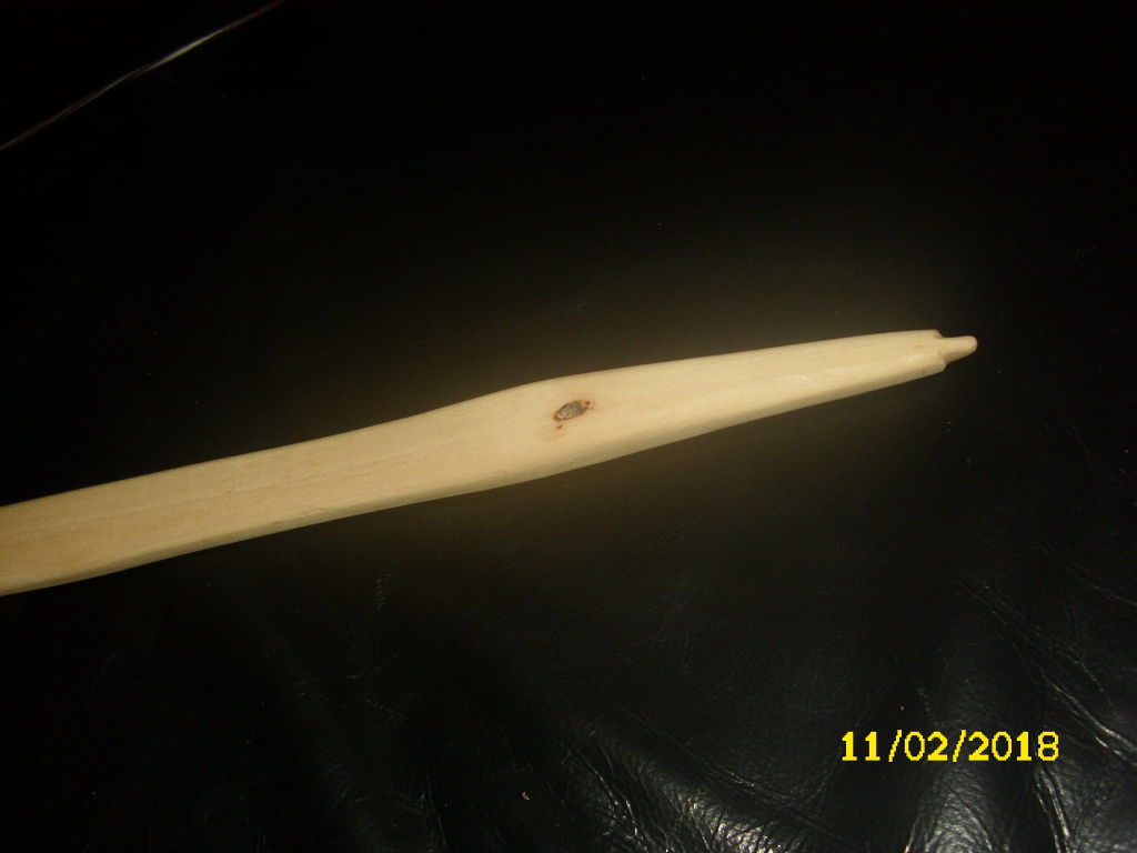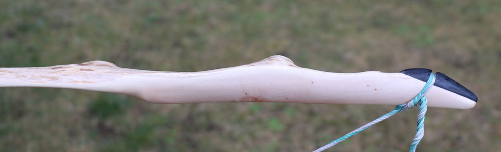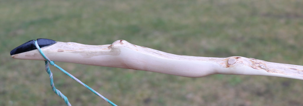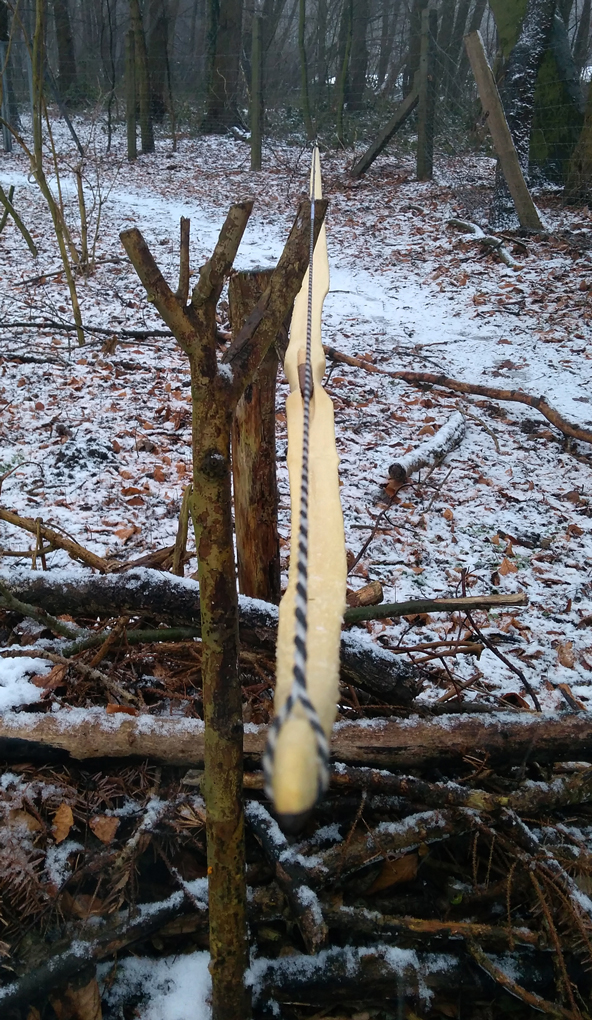 Ich wollte einen zweiten Bogen bauen, im Falle das es mit dem ersten Bogen nichts wird. Dazu habe ich einen Holler entdeckt, dessen Stamm vielversprechend aussah. Dieser Bogen ist aber aus dem Ast des Baumes. Er war krumm und es gab keine Alternative den Bogen anderst in den Ast rein zu legen.