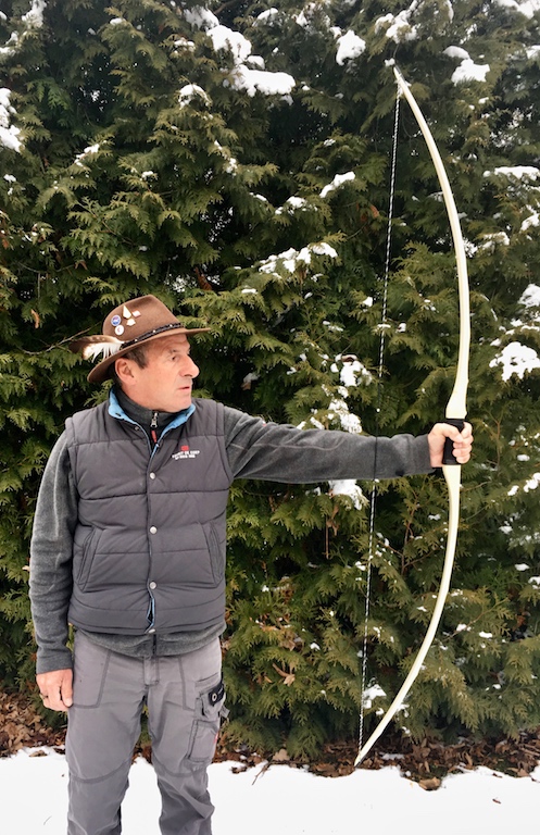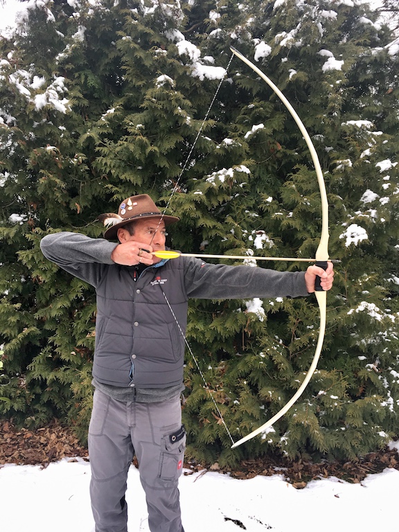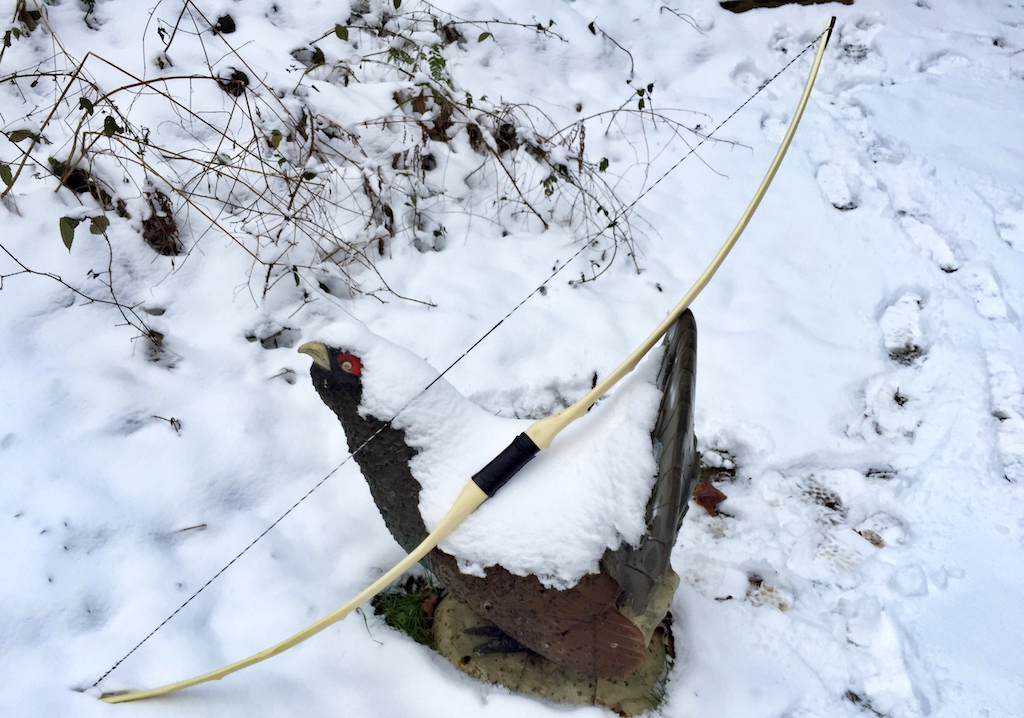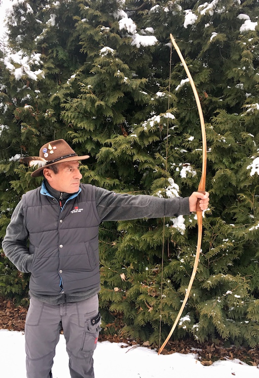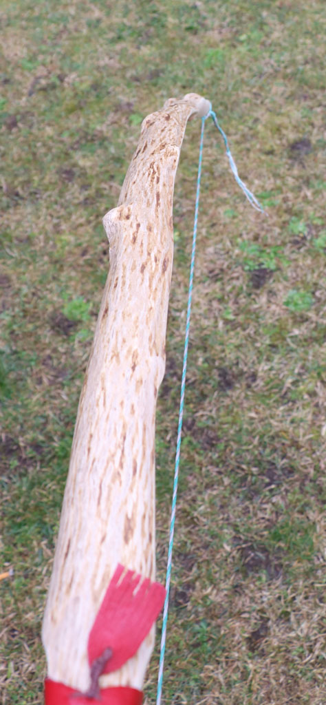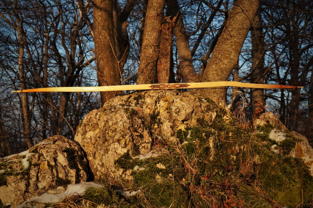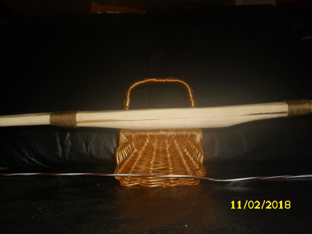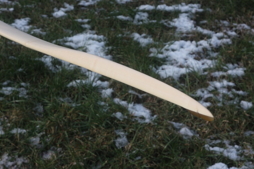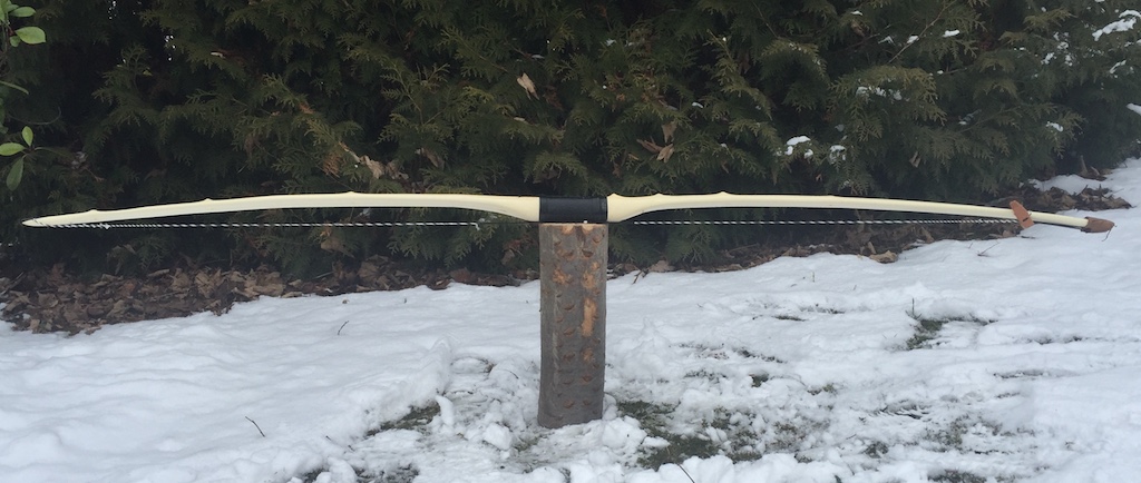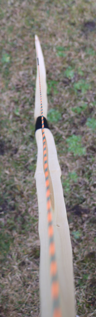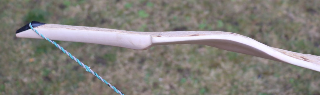 Fotos vom ungespannten Bogen , auf Standhöhe , Vorderansicht und Vollauszug sowie die Nennung der üblichen Daten zum Bogen sprich Auszug , Zuggewicht , Länge, Holzart etc