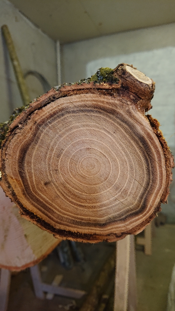 Wenn du den Stamm teilst aufpassen, dass eine Haelfte die duennen Ringe und die andere die dicken hat, sonst werden die beim Trocknen oder spaetestens beim Ausschneiden krumm.