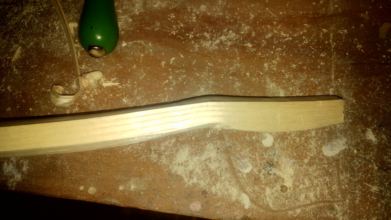 Wenn Du mit dem Taper (=Dicken-Abnahme) vom Griff aus an der "Welle" angekommen bist, zeihst Du die Dicke, (sagen wir mal als Beispiel: 12 mm) einfach erst mal per Lineal bis zum Ende gerade durch. Dann kannst Du in der Mitte der Welle die Dicke auf 13 - 14 mm reduzieren. Schöne weiche Übergänge machen. Dann vermisst Du Dicke noch mal genau, und hast Du nirgens die 12 mm unterschritten kannst Du ab der Welle zum Ende hin noch auf 10 mm reduzieren - (muss aber auch nicht, SOO viel macht das bischen Holz nicht aus...)