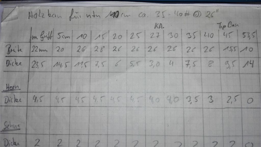 danke erst mal. Ich habe bei dem Bogen noch die gerade Klebefuge zwischen Holz und Horn, was den Holzkern dicker aussehen lässt. Also mein Verhältnis vom Horn ist 1/3 der gesamten Dicke .In Richtung Griff nimmt das Holz etwas zu und der Griff(die ersten 15cm sollen eh nicht biegen). Karpowicz sagt, dass Verhältnis des Horn /Holz /Sehne sollte je 1/3 haben. Wenn der Holzkern etwas dicker ist, wäre er etwas stabiler und wenn der Holzkern dünner ist wäre etwas instabiler(also muss mehr gerichtet werden). Was für ein Verhältnis wäre denn ideal, das der Bogen stabil bleibt? Ich habe mit den Daten bereits ein Bogen gebaut, der meiner Frau und der hält bis heute.