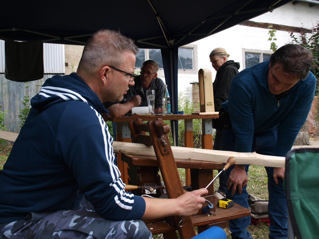 Auf Schnitzböcken unterschiedlichster Art wurde am Bogen, am Leder oder an der Wolle gewerkelt.
