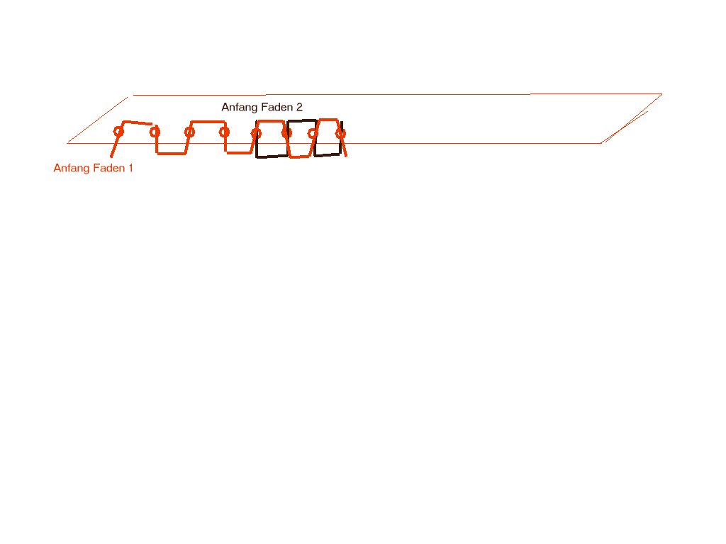 Fange nicht mit beiden Fäden an der gleichen Stelle an sondern versetzt Einmal rundherum genäht kommst du mit dem schwarzen Faden ja wieder bei dem Roten an und schon ist die Naht oen u. unten geschlossen. Lasse die Fäden bei 2-3 Stellen überlappen und nähe/ziehe dann die Fäden zwischen die beiden Stücke Leder-Stoff das hält dann schon und du brauchst keinen Knoten zu machen (sieht einfach besser aus).