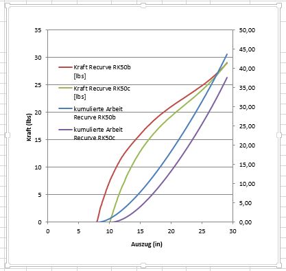ich habe jetzt einmal die Standhöhe ordentlich erhöht auf 10". Sieht für meine Geschmack unschön aus, aber- Die Auszugskurve zeigt nach oben hin fast keinen Unterschied in der Zugkraft, da sie später anfängt, ist die gespeicherte Energie natürlich geringer - Der Schusskomfort ist weeesentlich höher, klar, noch ein wenig Handschock aber nichts im Vergleich zu vorher - Die gemessene Pfeilgeschwindigkeit ist gleich bis tendenziell noch einen Tick höher als zuvor. Immer noch verwundert aber so ist es im Moment. Ich werde also im nächsten Schritt die Anstellwinkel reduzieren, so dass ich bei gleicher Standhöhe wie zu Anfang, also ca. 8" eine ähnliche Vorspannung habe wie mit den 10". Dennoch merke ich, dass dies nicht mein Weg sein wird