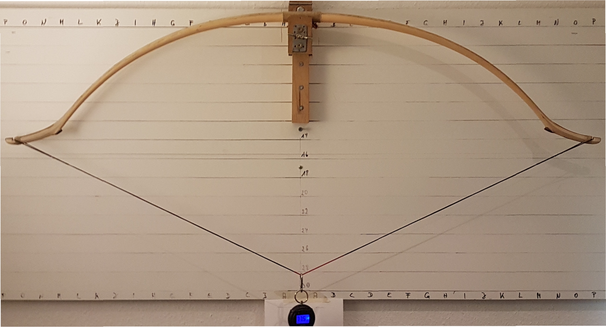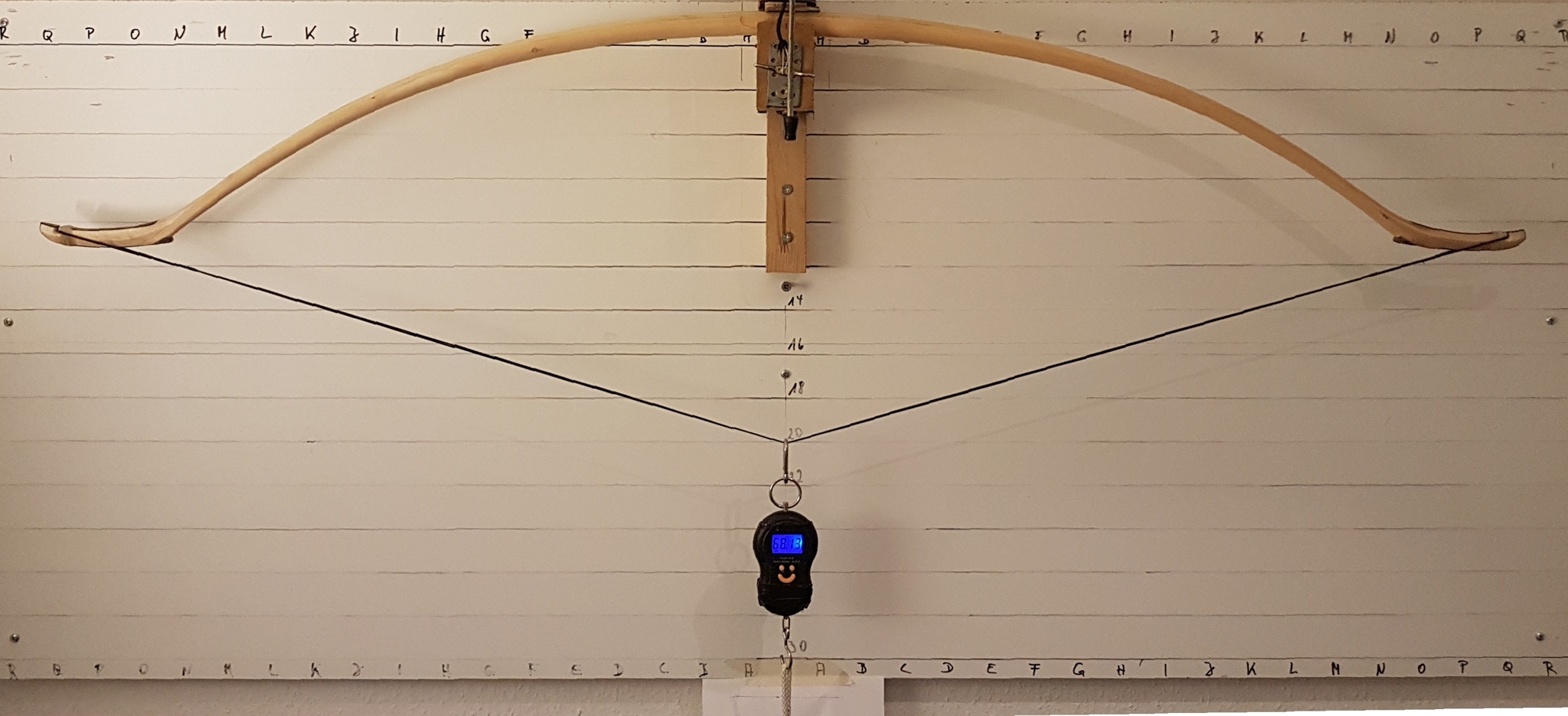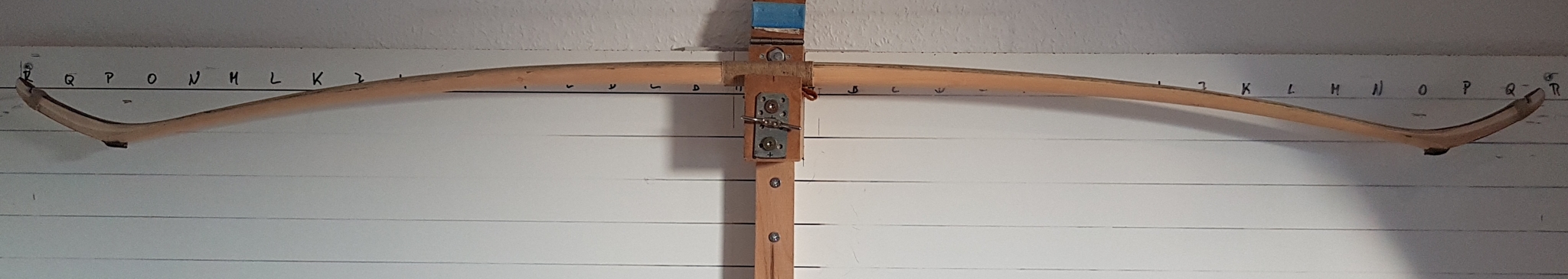 Aber hier nochmal der letzte Stand, ich war gerade soweit, dass ich das Ding ziehen kann. Gewicht ist jetzt 642 g, Zuggewicht 77#@28". Das ist ein ordentliches Gewicht-Zuggewicht-Verhältnis, vor allem wenn man bedenkt, dass die Hölzer ziemlich schwer sind.