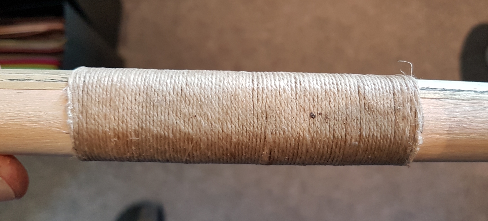 Ich habe die Sehnenbänkchen nochmal verkleinert und Leder aufgeklebt. Eine erste Wicklung zum Griffaufbau ist auch drauf.