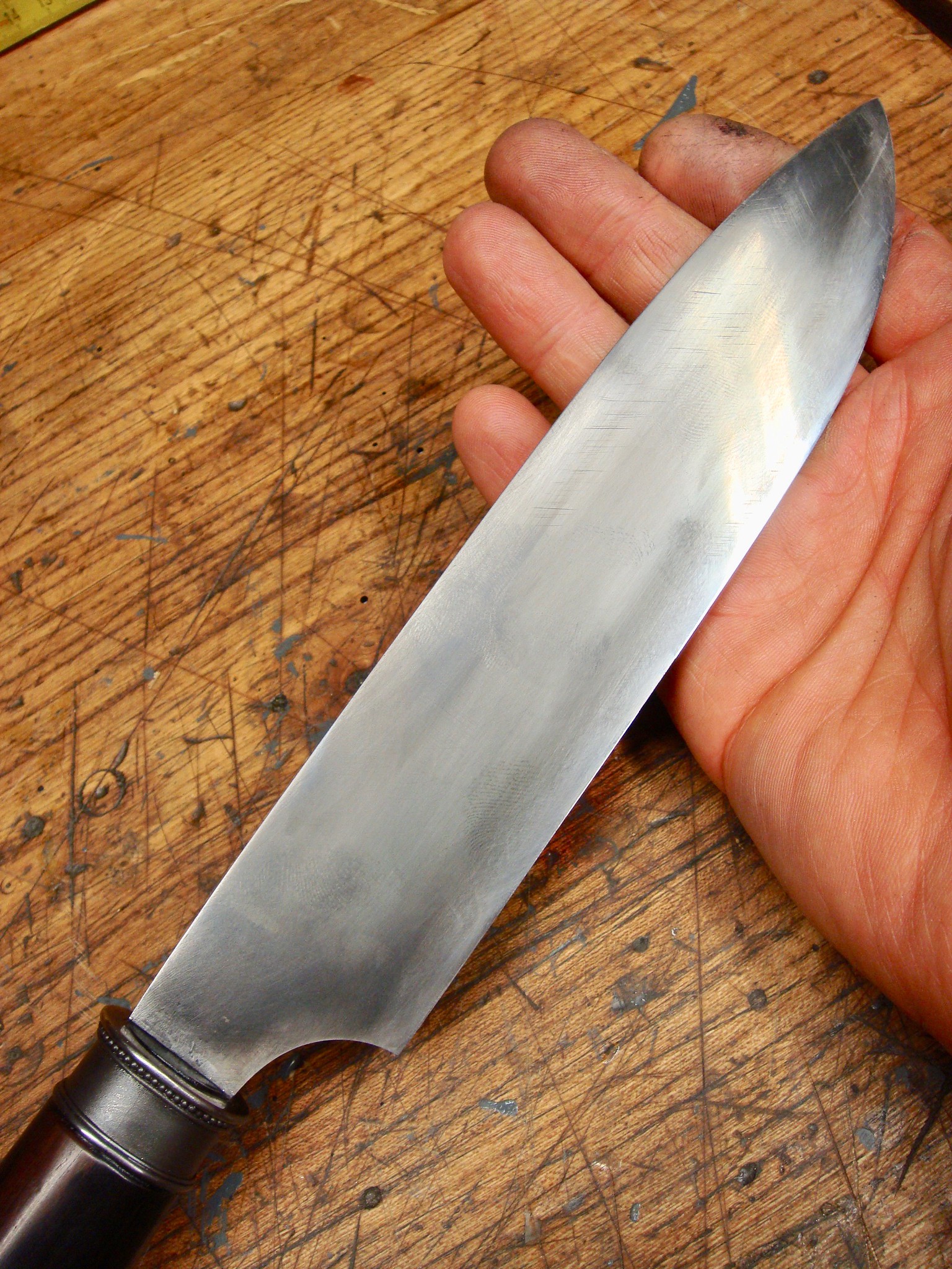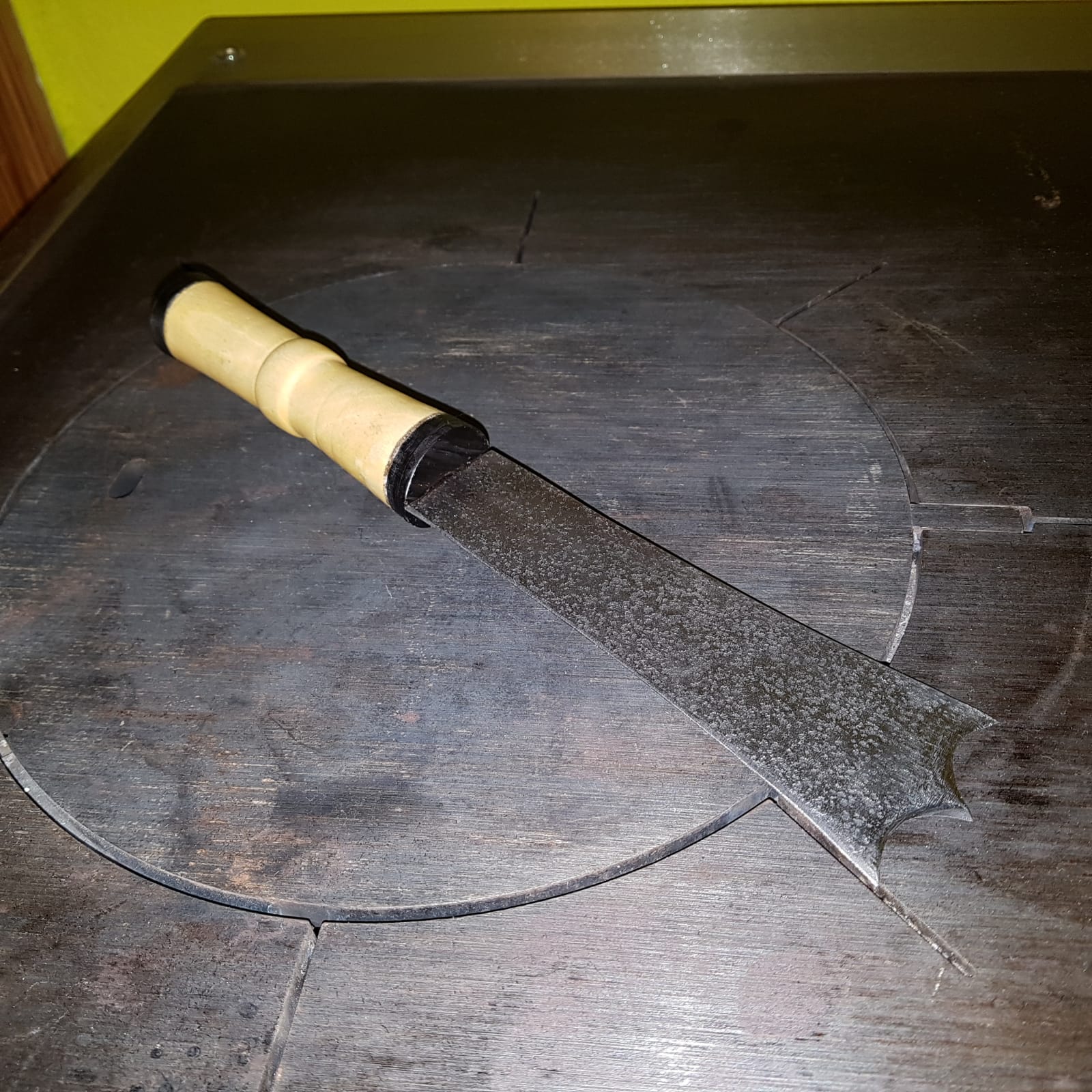 Das Messer ist ca 3,2mm dick und ist das Längste, das ich bisher gehärtet habe - knapp unter 40cm mit Erl, aber ohne Griff.