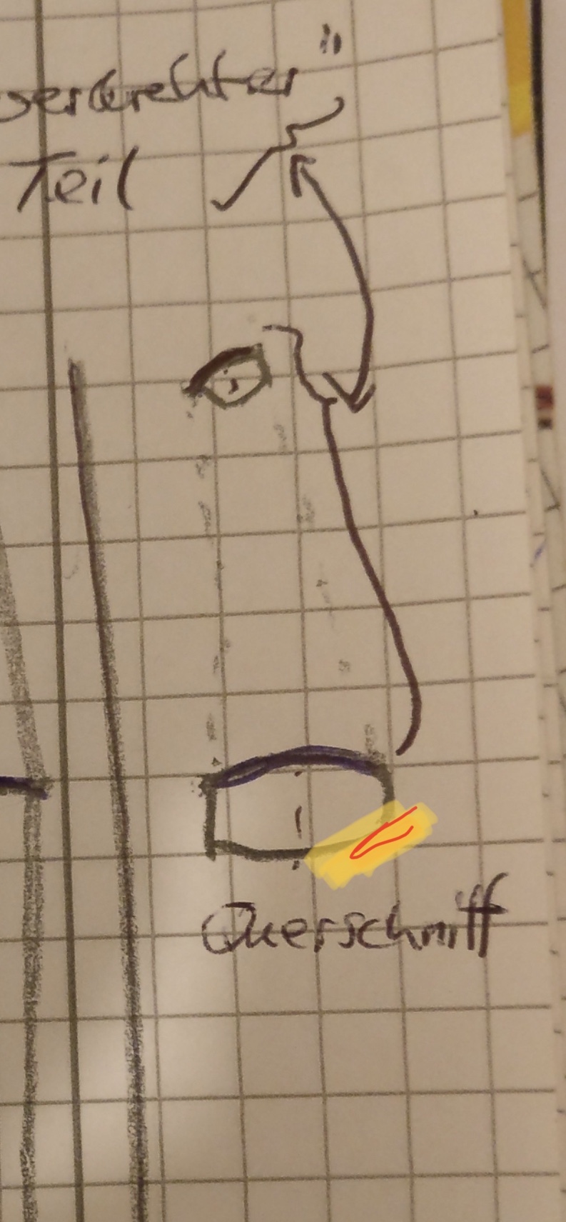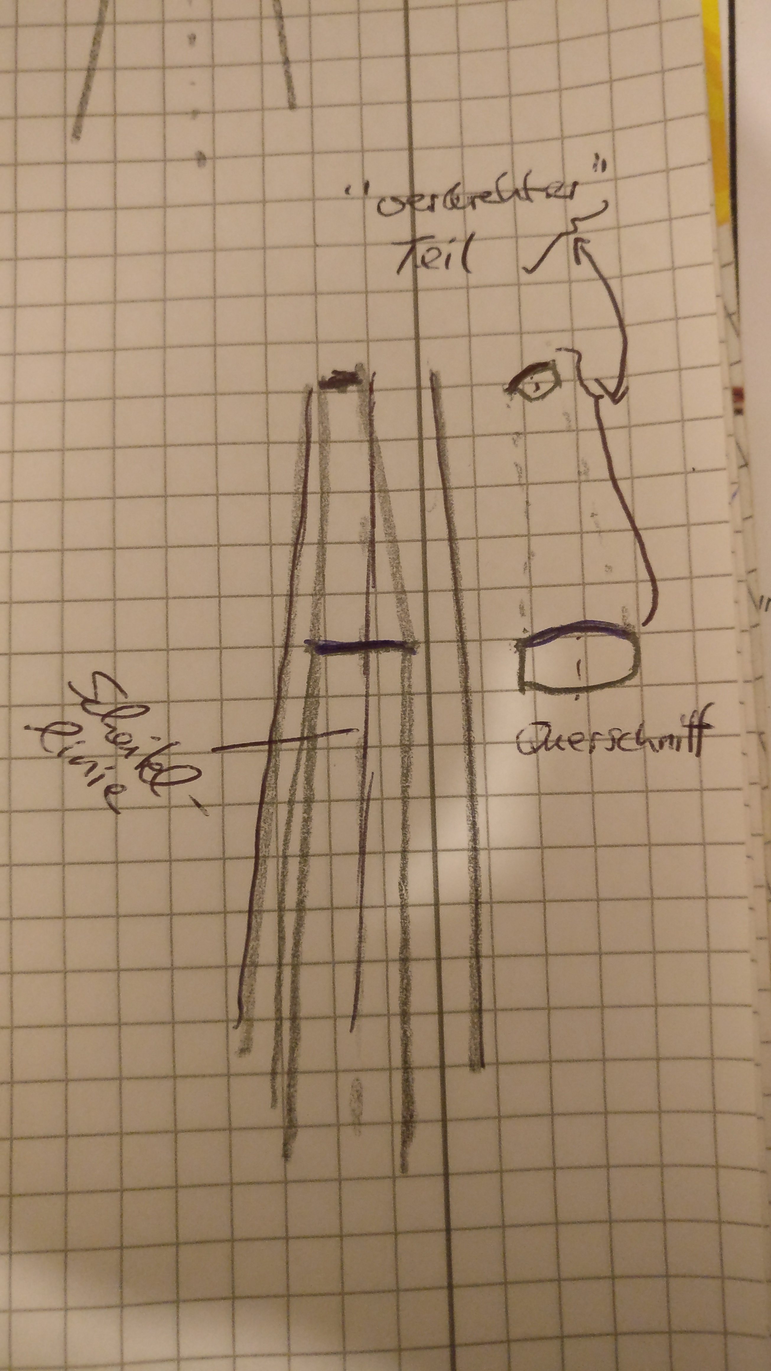 Ich habe, um die Sehnenlage im Griff in Richtung Mitte zu korrigieren, die Nocken/Tips? an beiden Wurfarmen um 1 cm (je in die selbe Richtung) von der Scheitellinie verschoben. An der einen Seite (die mit dem ehemals dünneren Durchmesser) habe ich jetzt folgendes: der Bogen scheint sich zu "verdrehen". Dies liegt nicht daran dass der Stave selbst verdreht ist, sondern an dem runden Querschnitt und dasss ich ihn durch das Verschieben der Nocke "verdreht" geschnitzt habe. Ich hoffe es ist verständlich was ich meine. Zum besseren Verständnis und da auf Fotos schlecht zu erkennen, habe ich (trotz mäßiger Zeichenkünste) versucht eine Skizze anzufertigen. (Den Bogenbauch habe ich versucht etwa parallel mit dem Bogenrücken zu schnitzen, sodass sich dieser mit verdreht). Ich schätze die Verdrehung auf etwa 20° über einen Bereich von 35 cm.