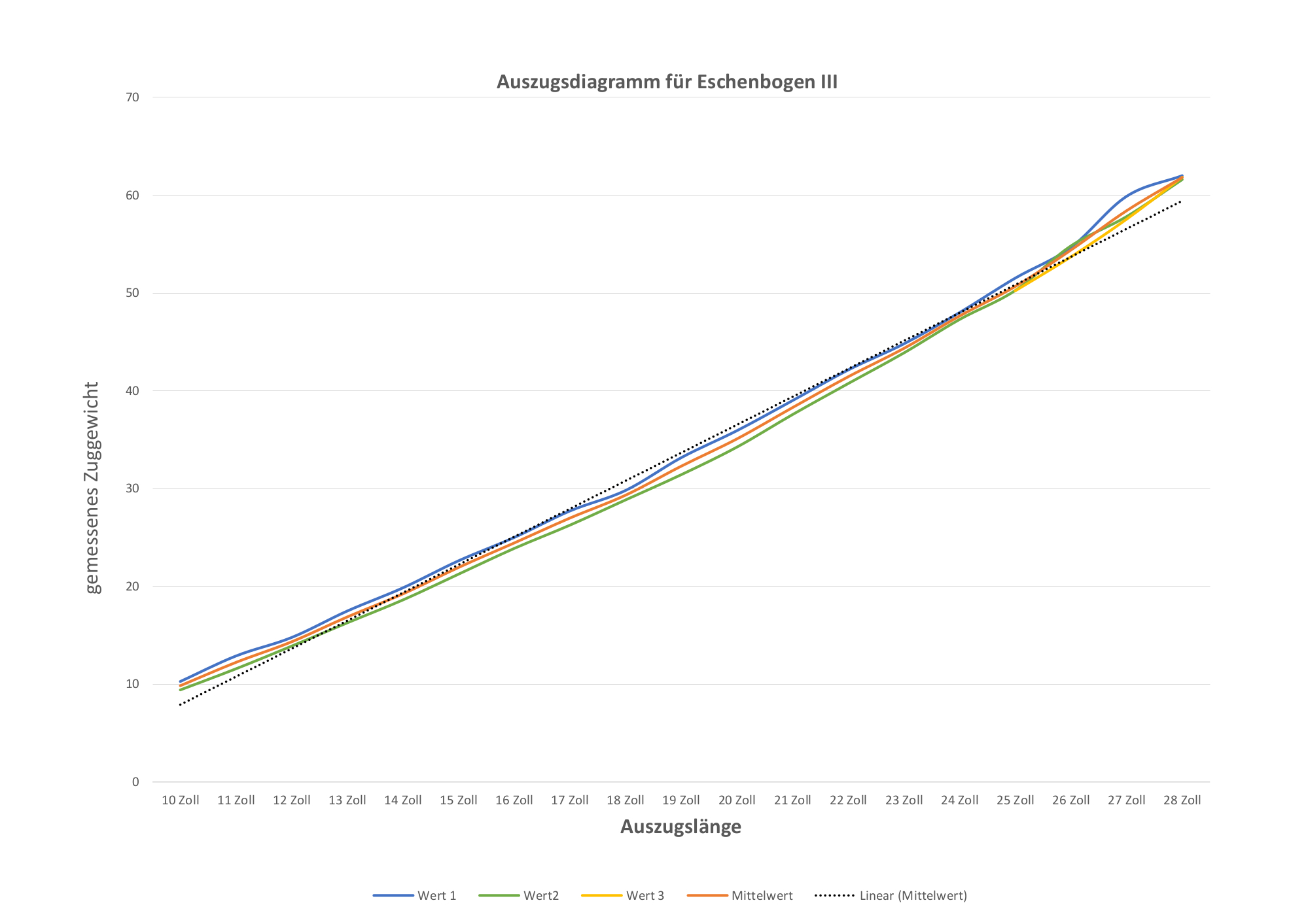 Bin mir nicht 100% sicher wie ich das zu interpretieren habe. Ganz linear ist es offensichtlich nicht, würde mich aber auch wundern wenns so wäre. Zum Ende hin wird der Anstieg schon deutlich steiler, so ab 25-26 Zoll. Auch wenn man die Messungenauigkeiten mit einkalkuliert, denke ich kann man da nen Trend feststellen. Wenn die Kurve zum Ende hin weniger stark anziehen würde, also das potentielle stacking rausrechnet hätte man vielleicht 60#. Kein Riesenunterschied finde ich. Was meint ihr? ??? :)