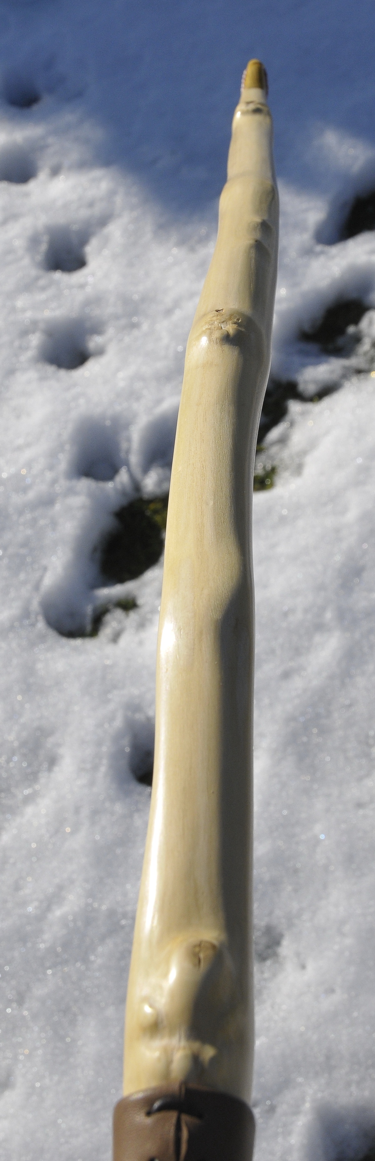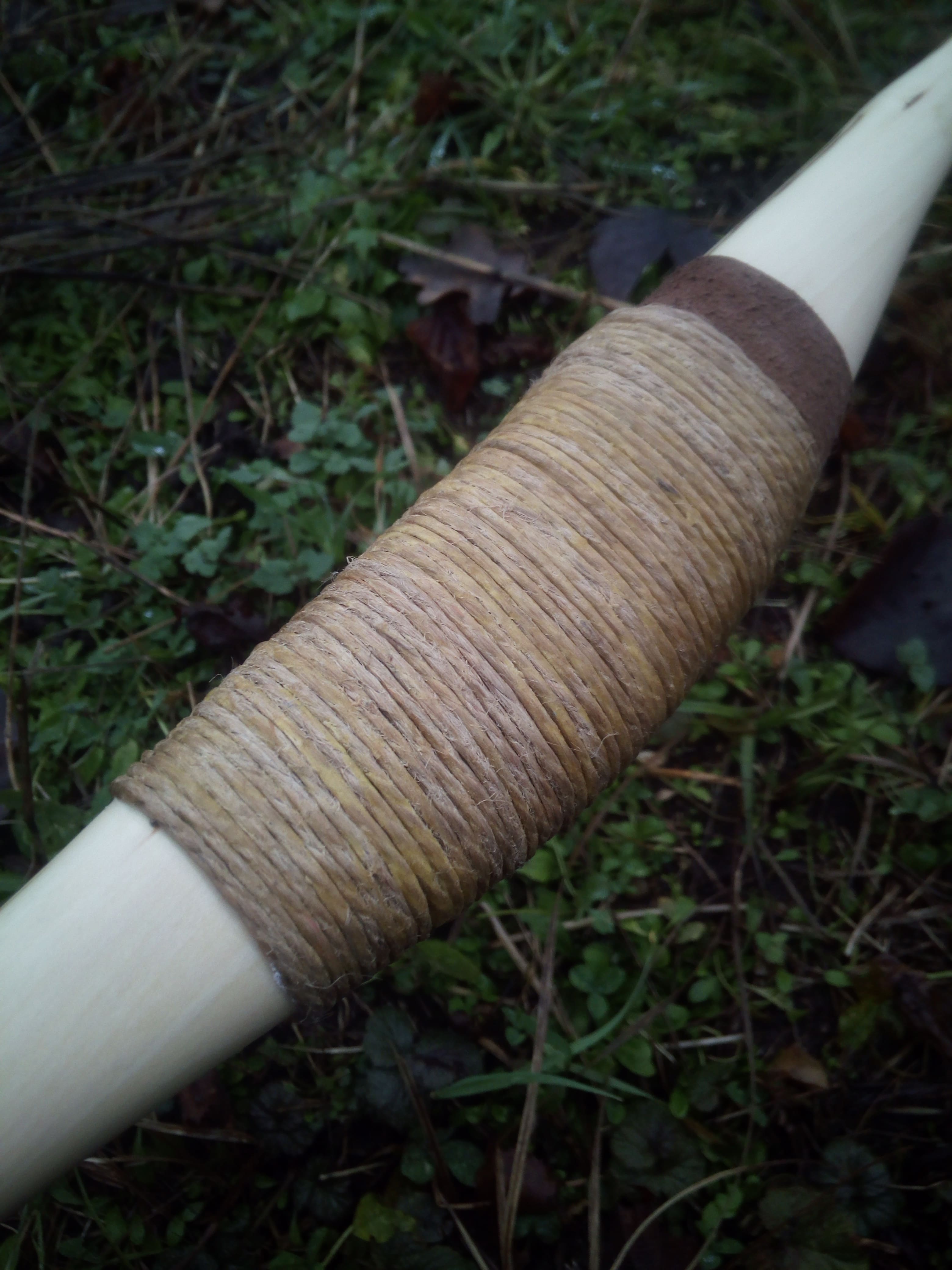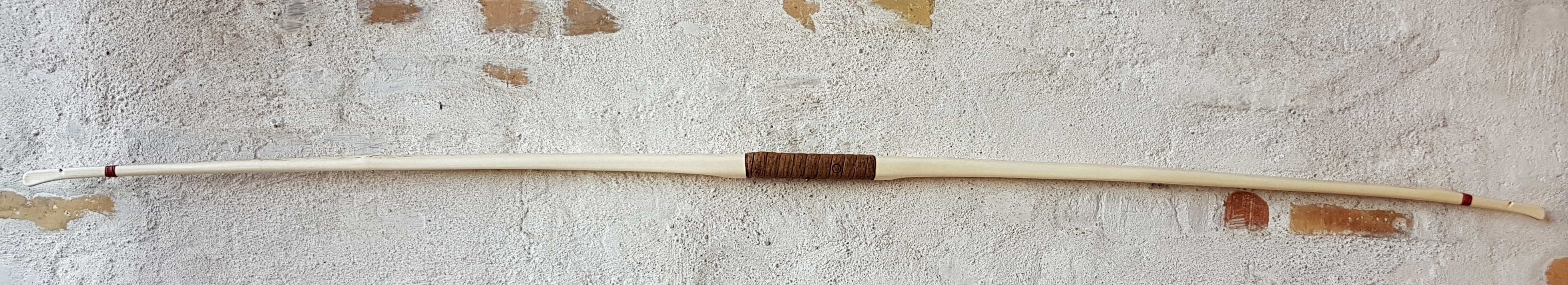 Die Inspiration zu diesem Bogen waren die Oberflacht-Bogen. Der Griff biegt bei dem hier etwas mit, ganz steif ging aufgrund der Saplingdicke nicht. Aber egal.