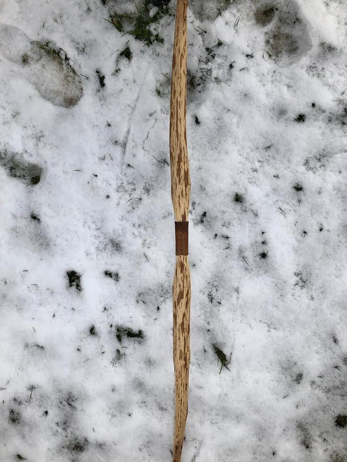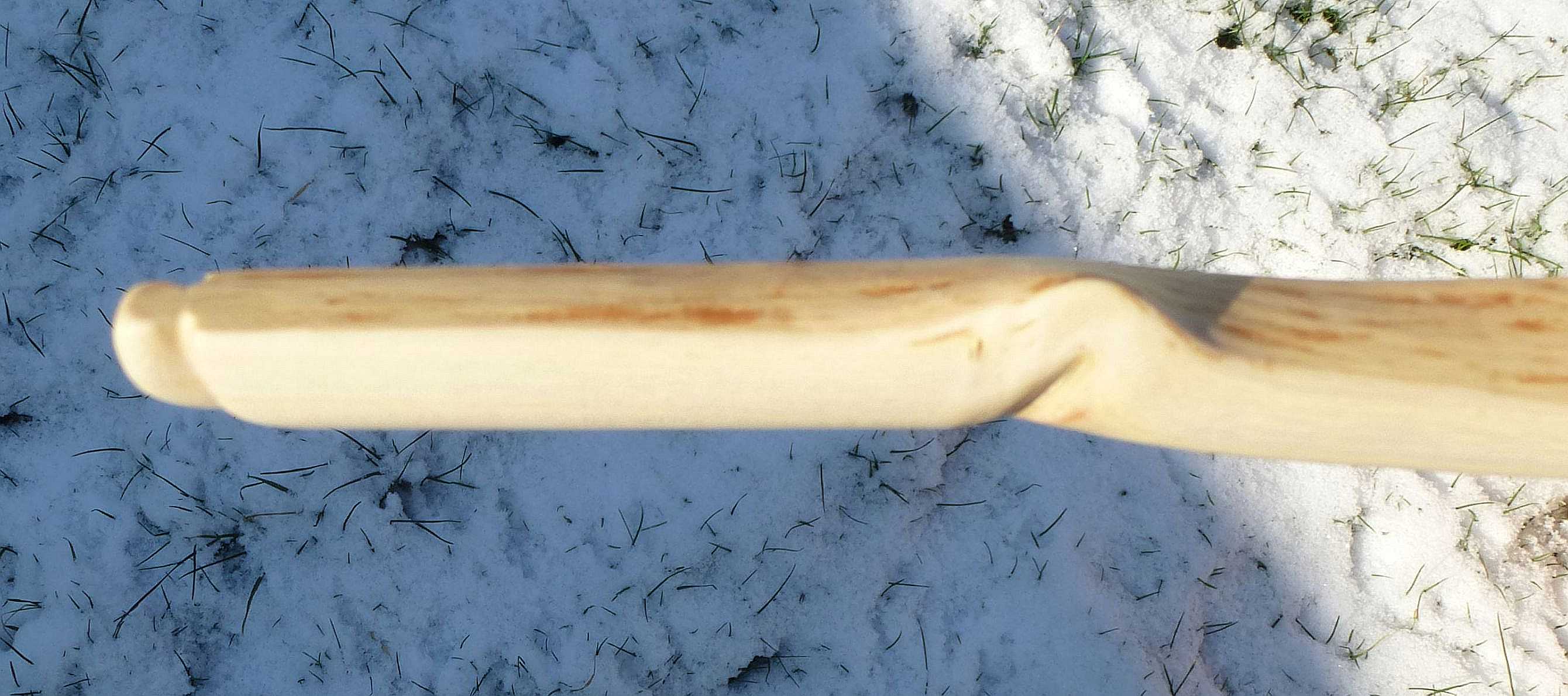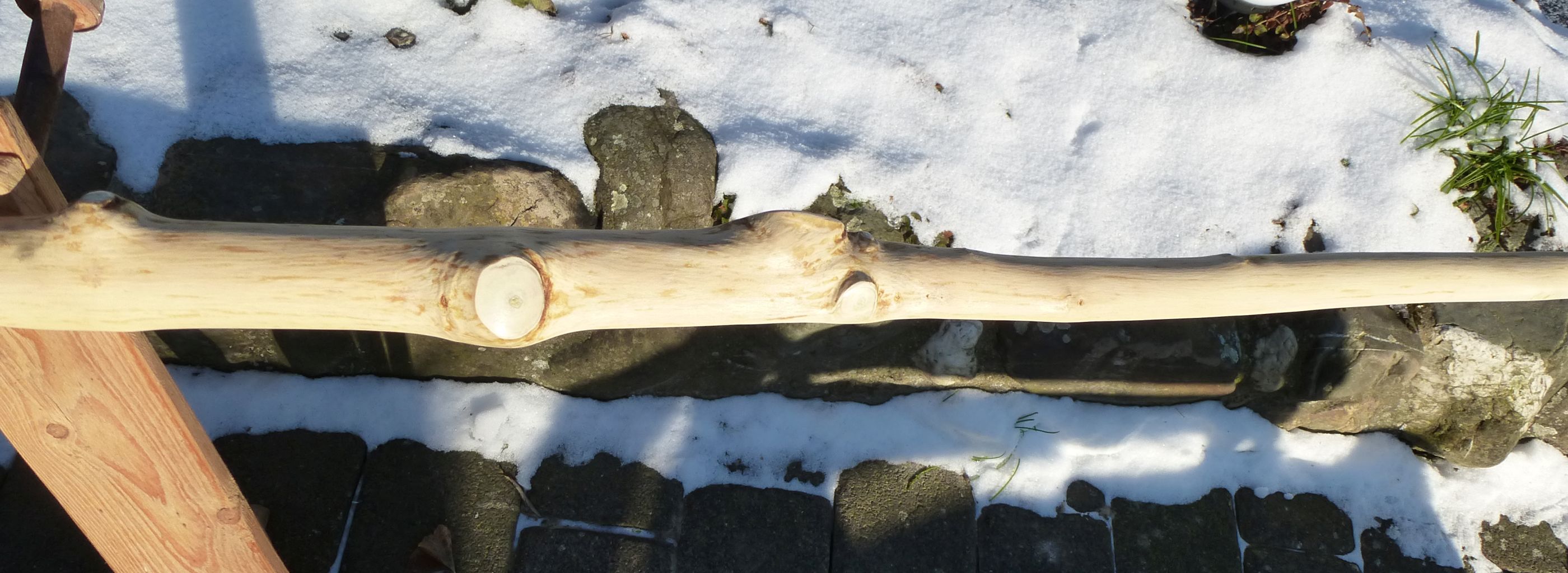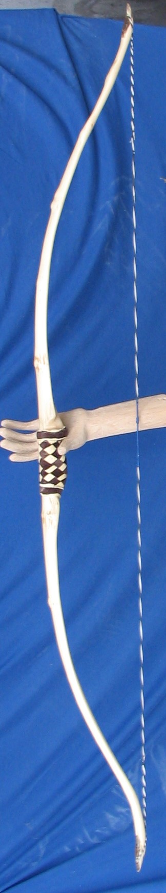 Die Inspiration zu diesem Bogen waren die Oberflacht-Bogen. Der Griff biegt bei dem hier etwas mit, ganz steif ging aufgrund der Saplingdicke nicht. Aber egal.