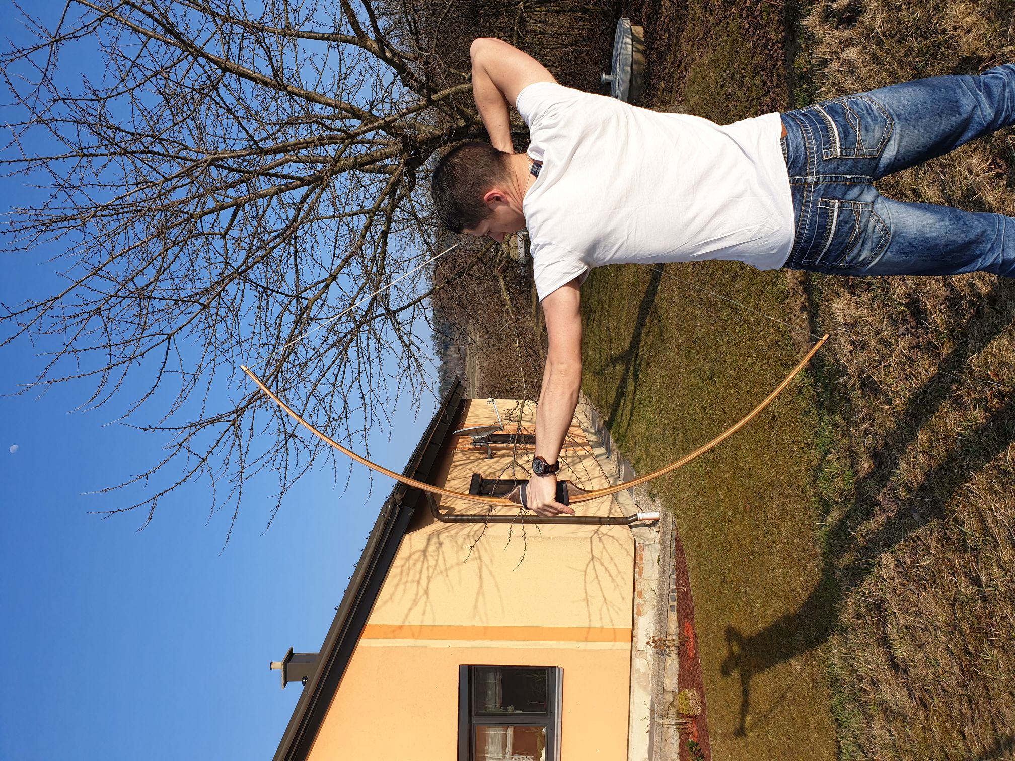Die Länge beträgt Nock to Nock 64" und er zieht auf meinen Auszug von 26,5" genau 40#. Die Wurfarme sind Pyramidal verjüngt und die Bauchseite ist um einiges Breiter als der Rücken. Beginnend mit 33mm am Bauch und 24mm am Rücken verjüngt er sich auf 12mm am Bauch und 8mm am Rücken. An der Nocke ist er somit auch 8mm breit. Dazu hab ich eine flämisch gespleiste Sehne mit 10 Strang Spectra die an den Öhrchen mit Dacron verstärkt ist. Die Standhöhe beträgt 6,5". Das Finish hab ich mit 800er Schleifpapier und Holzbalsam von Dick gemacht.