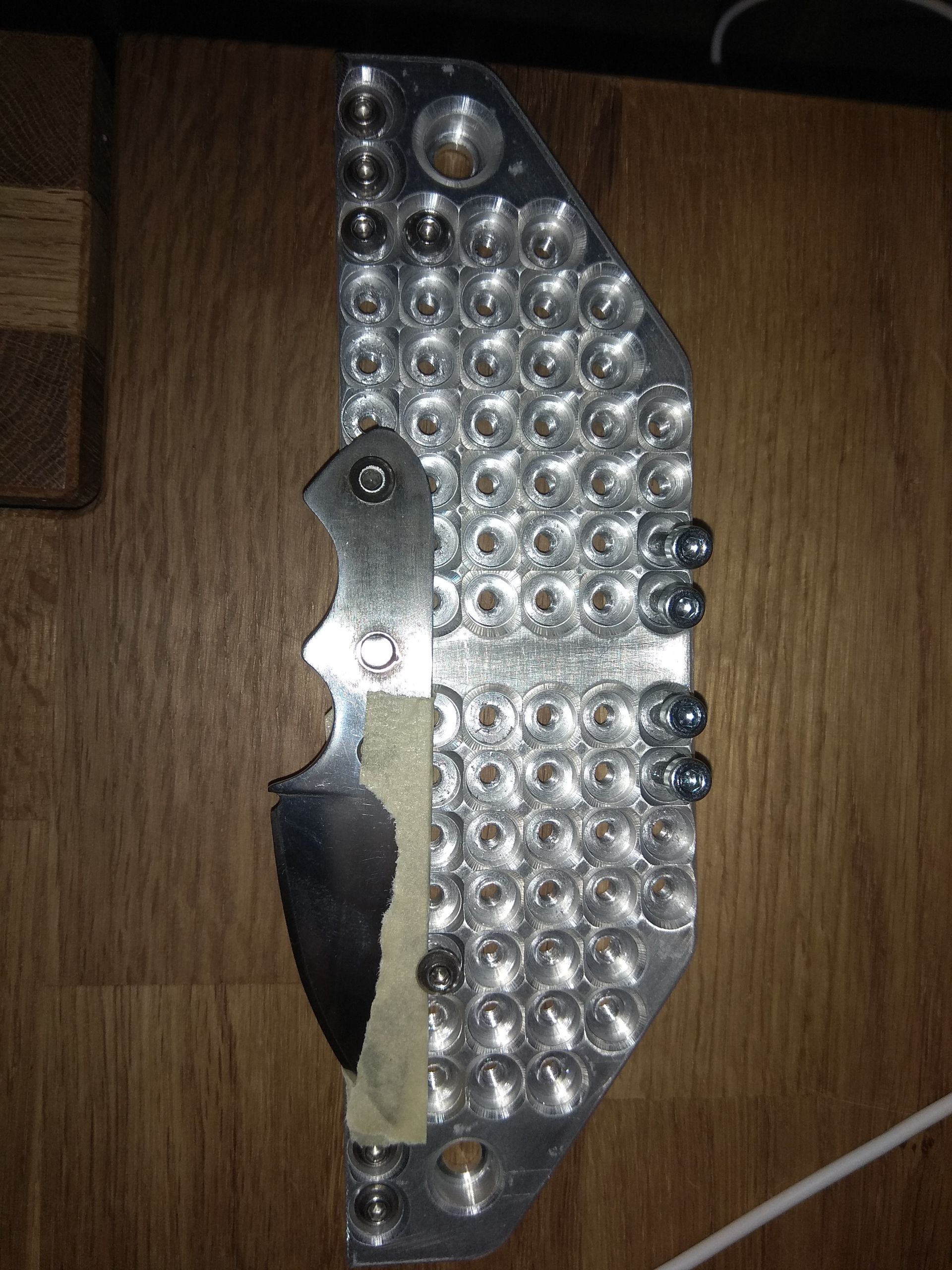 Der Rohling soll mittels Schrauben darauf fixiert werden werden, damit der Schneidenwinkel einfacher gefeilt werden kann.