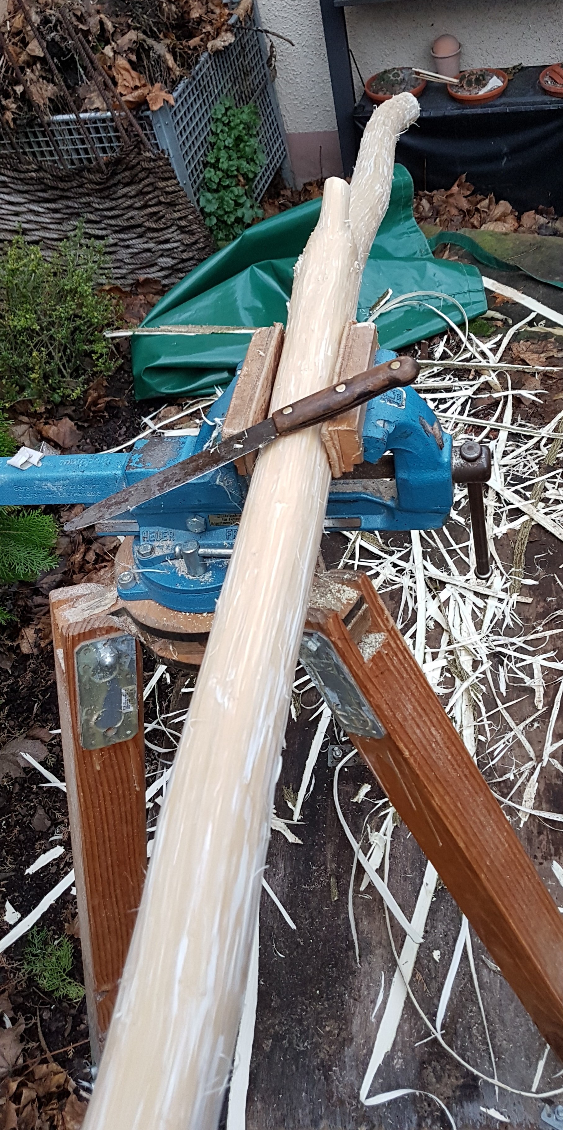 Danach noch seitlich etwas Holz mit dem Ziehmesser entfernt und beide Stücke auf einen Balken gezwungen.