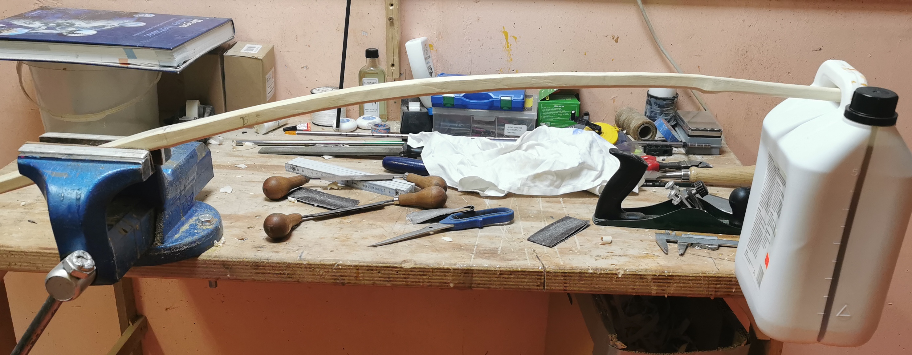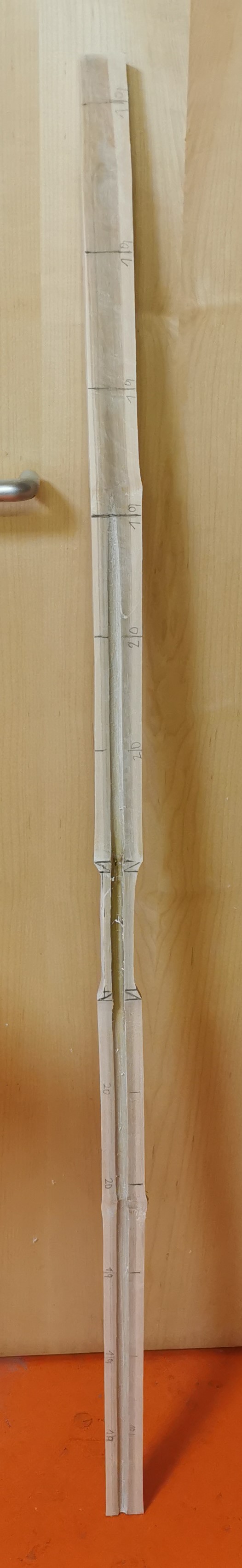 Heute habe ich am Stabbogen in spe wieder Material abgetragen, an der dicksten Stelle in der Mitte hat er jetzt noch 25mm, und wiegt noch 511g, bei der leichten Verdrehung ist es geblieben, und er ist immer noch kerzengerade. Ob das mit den 50-60# was wird, keine Ahnung, wirkt momentan noch etwas weich, ist aber auch noch nicht trocken.