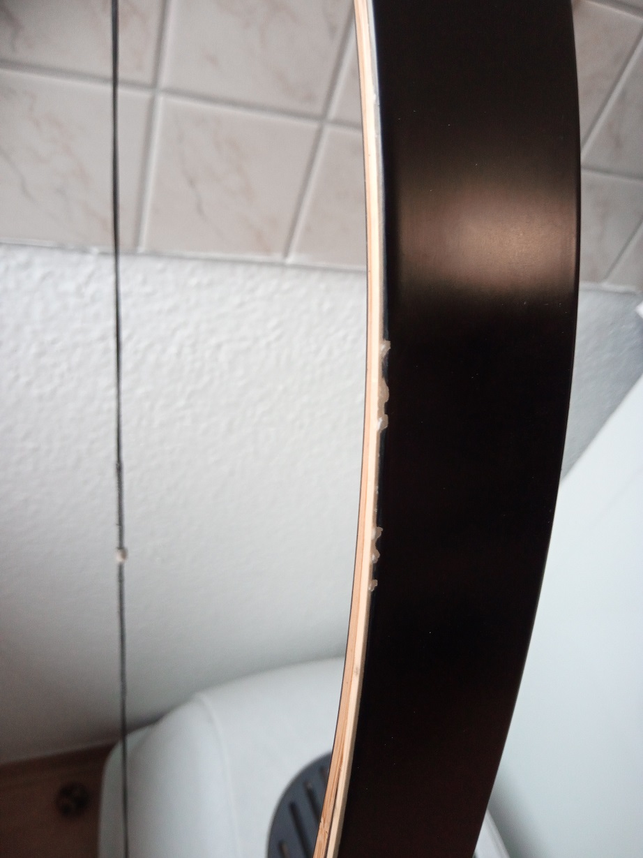Anbei Bild eines Malheurs an einem glaslaminierten Bogen, prompt wieder an der Seite/Kante , ca. in der Mitte des oberen Wurfarmes. Die Schäden sind vielleicht max. 0,5 mm im Durchesser. Tiefe schätzungsweise 0,1-0,2 mm. Man fühlt sie beim Drüberstrichen mit nem Fingernagel.