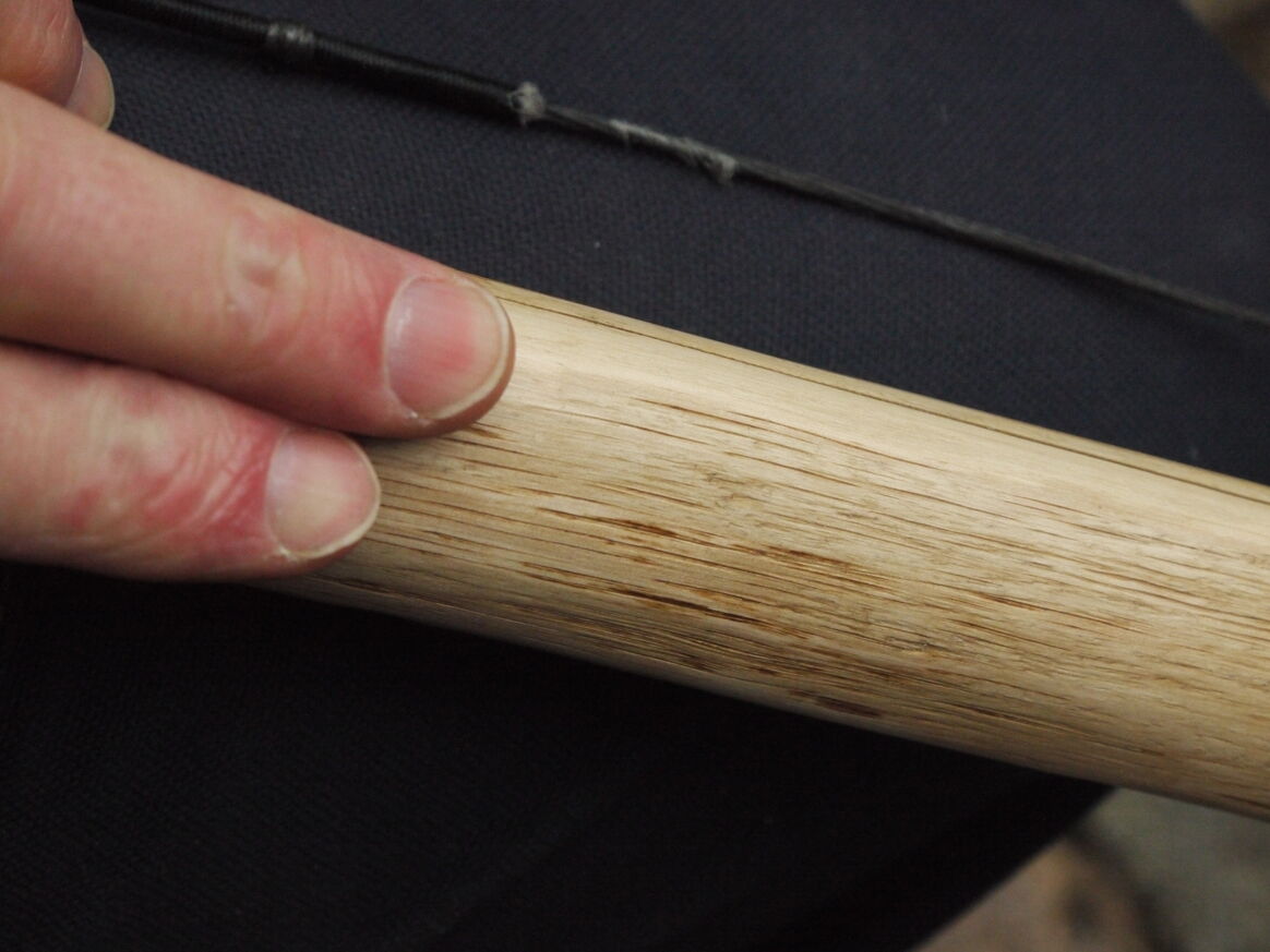 Der Fichsel stand jetzt fast 2 Jahre unbeachtet im Eck, wo lauter unbeendete und irgendwie missratene Boegen stehen. Vor ein paar Wochen hab ich da mal ein bissl aufgeraeumt und der Kerl war stangerlgrad. Keine Ahnung wieso. Ich hab ihn dann nochmal auf den Tillerstock aber er war eingentlich eh schon fertig. Ich hab ihn dann noch geschliffen und Hartoel und Wachs drauf.