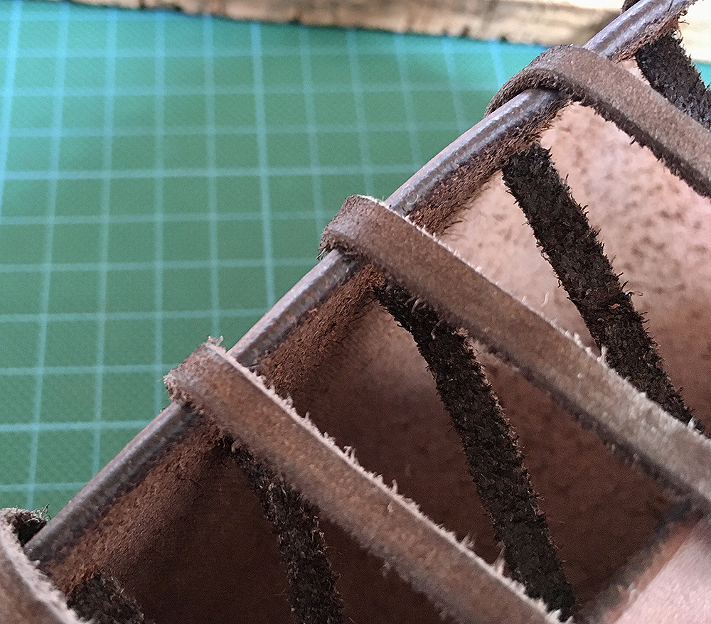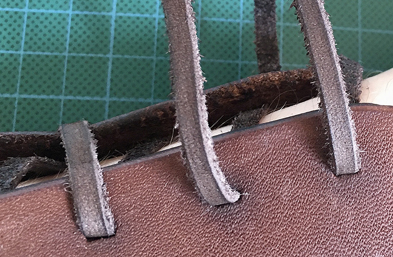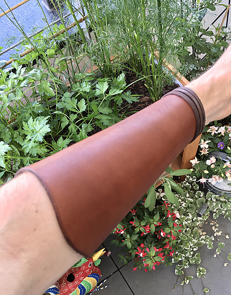 Die Schnürung ist weiches Lederband. Damit es noch weniger stört habe ich keine Löcher gestanzt, sondern Rechtecke mit der Klinge geschnitten, sodass die Bänder ohne Verdrehung geführt werden. Knöpfe und Schnallen sehen bei mir meist überdimensioniert und klobig aus, weswegen ich die Schnürung passender finde, auch wenn es mehr Arbeit beim Schnüren bedeutet. Das Ende wickel ich einfach mit ein paar Schlaufen. Sieht unprofessionell aus, aber hält bisher. Vielleicht kann ich mir da noch was überlegen.