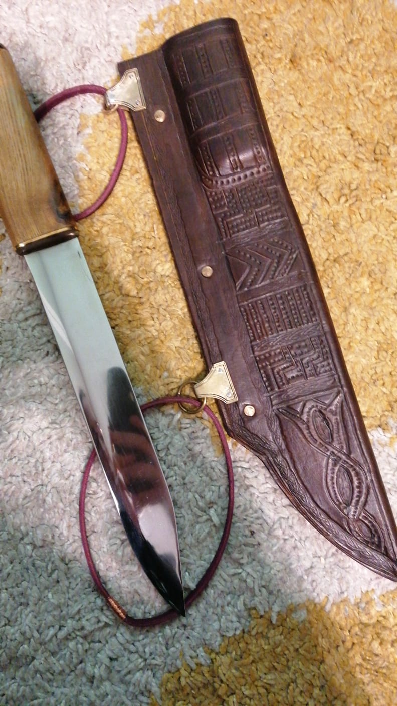 Wieder ein altes Sägeblatt benutzt und ähnliche Bauweise der Saxscheide aus natürlich gegerbtem Leder mit 3mm Stärke.