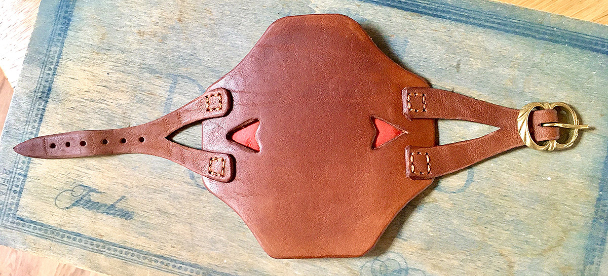 Riemen und Schnalle wurden beim Original nicht gefunden, aber der Hauptteil bestand aus dickem Rindsleder und einer Fütterung aus weichem Kalbsleder. Es wurden Anzeichen für rote Färbung des Leders gefunden. Meine Schnalle ist einfach eine typische Variante aus besagtem Jahrhundert aus England, obwohl das Schiff eher aus Spanien stammt. Im Original wurden vermutlich Nieten verwendet, ich hatte aber keine zur Hand, also genäht.