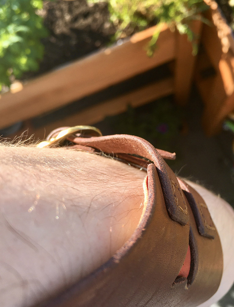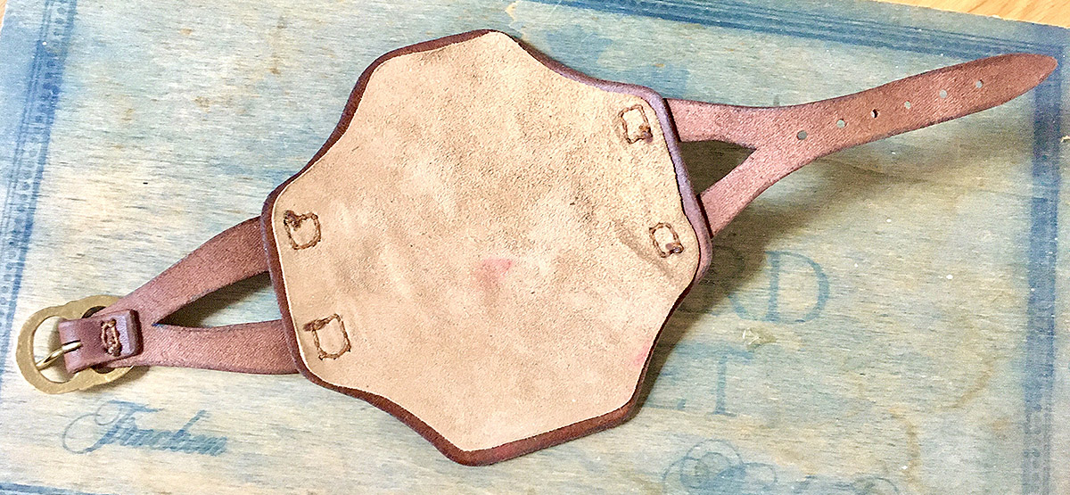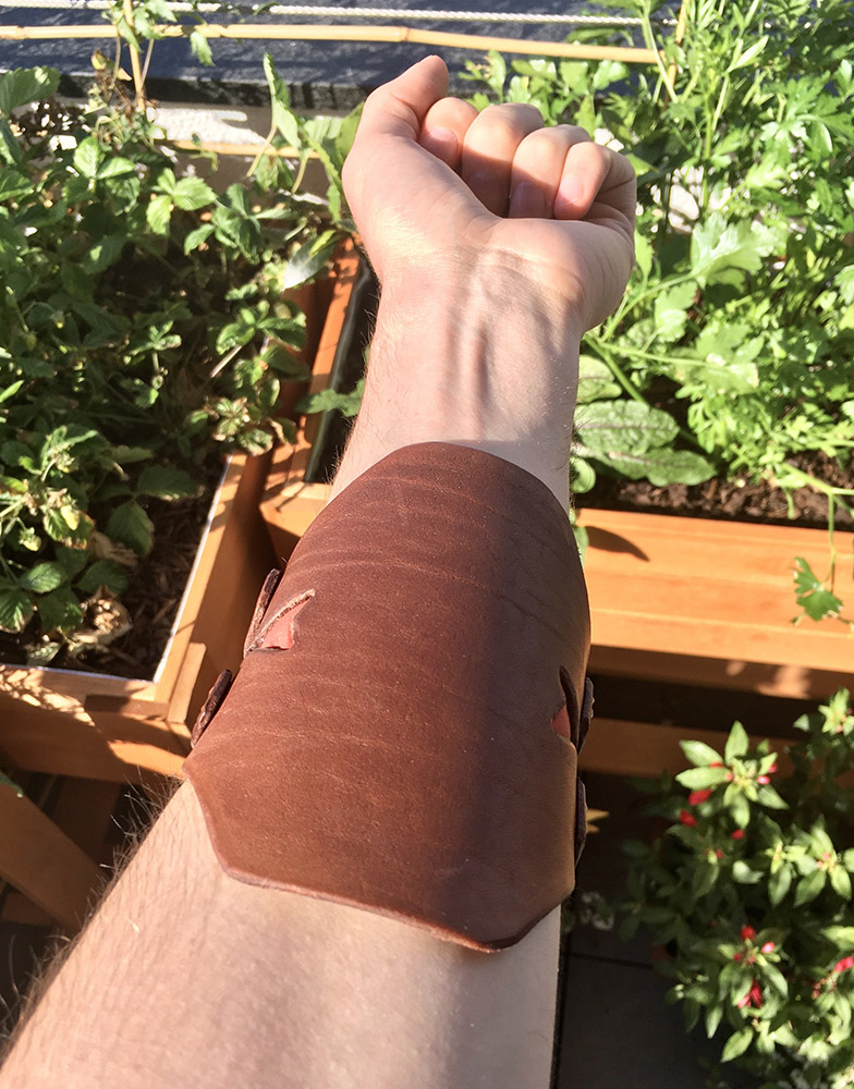 Und zu guter Letzt: Das Ding hält leider mal so gar nicht am Arm, zumindest nicht ohne Kleidungsstück drunter. Das Hauptleder fügt sich eigentlich dem Arm sehr gut an, aber die Riemenanbringung verjüngt sich nicht perfekt mit dem Arm und überhaupt ist wohl ein einzelner Riemen und ein so kleines Design einfach nicht dafür gemacht in der Mitte des Arms zu bleiben; es rutscht natürlich immer bis vor ans Handgelenk. Vermutlich wollten die Erfinder kostbares Material sparen. Es ist ja typisch für Gebrauchsgegenstände aus der Zeit nur das Nötigste zu verwenden. Eventuell wurde so ein Schutz auch immer über Kleidung getragen, dann funktioniert er auch.