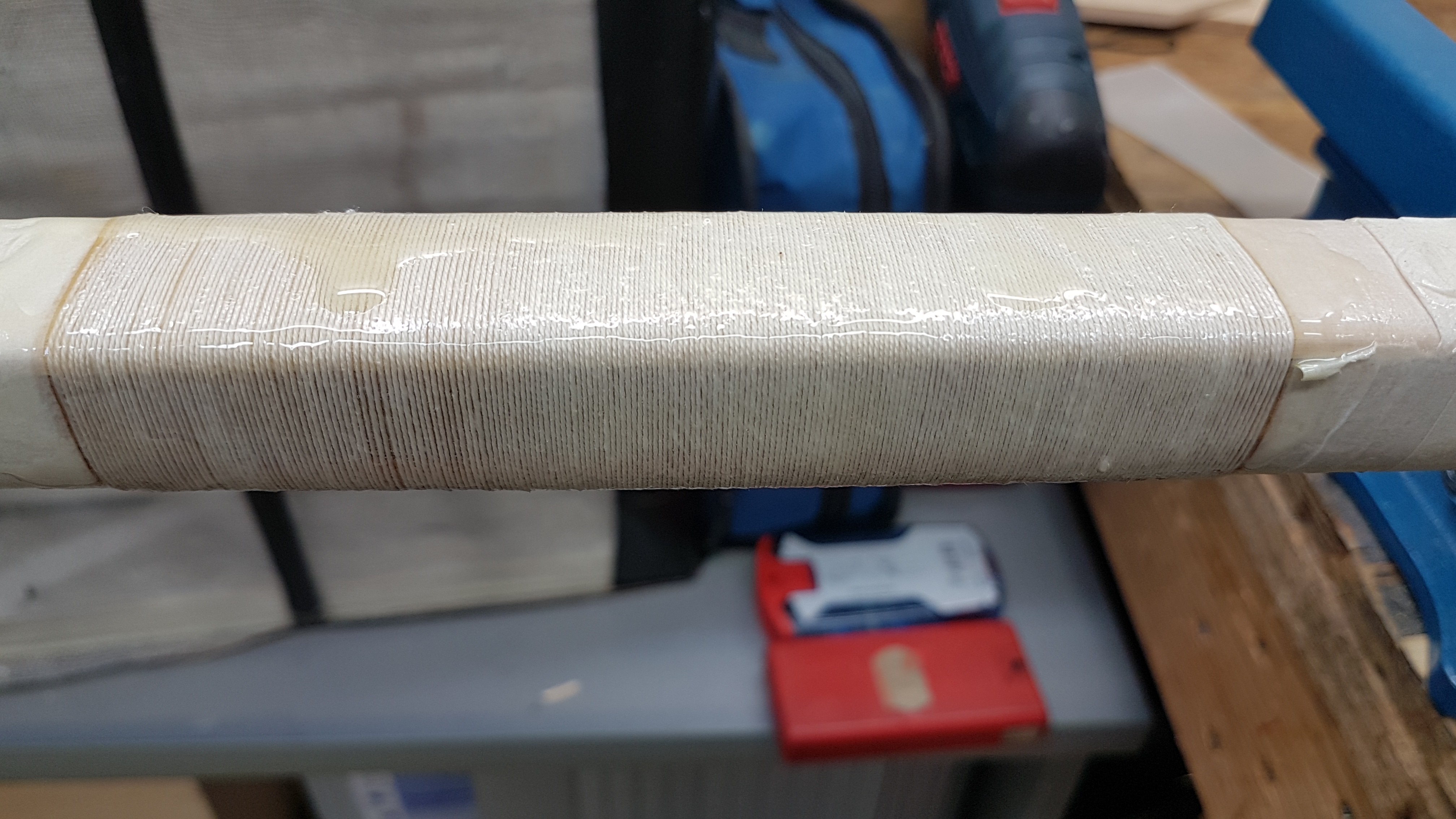 Step3: überschüssiges Epoxid abschleifen, Kanten der Bambusverstärkung gut abrunden. Wieder mit Epoxid einschmieren und die 2. Wicklung, dieses Mal mit dickerem Leinenzwirn Nr. 10, herstellen. Danach die Wicklung wieder mit Epoxid einschmieren und einföhnen.