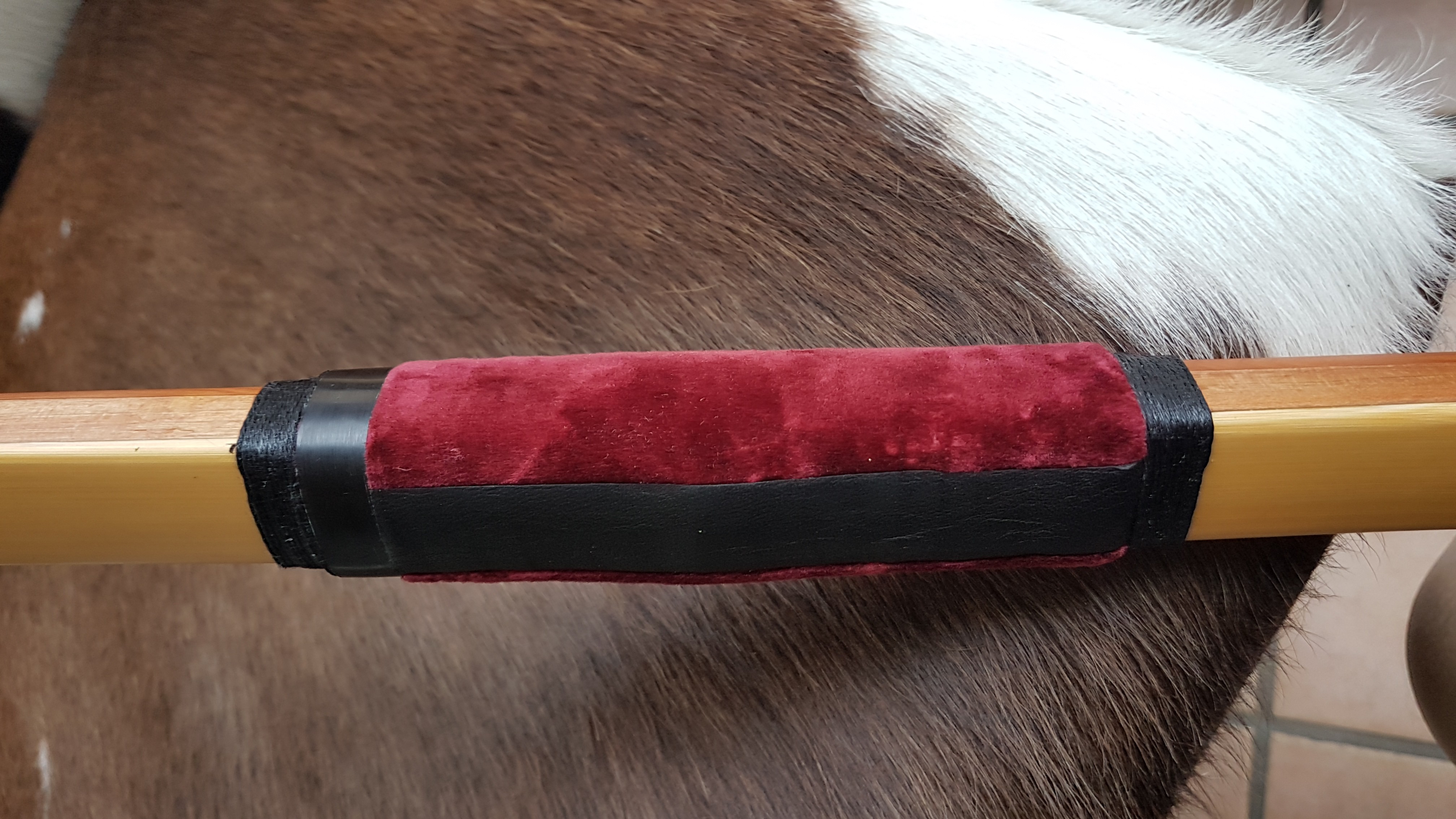 Step4: Hornspange (als arrowpass) schneiden, fein schleifen und mit Hitze anpassen. Baumwollsamt anpassen und mit Holzleim kleben. Hornspange mit Sekundenkleber aufkleben (Velourbelag des Samt zuvor mit Skalpell entfernt). Rückenseitige Lederabdeckung der Stoff-Stoßkante zurecht schneiden, ausdünnen und mit Holzleim aufkleben. Abdeckwicklung mit schwarzem Hanfzwirn oben und unten anbringen und mit Harz versiegeln. Erkennen, dass es besser ausgesehen hätte das Leder nicht über die Hornspange zu kleben und entsprechendes Teilstück wegschneiden. Fertig ist der Bogen, als hätte es nie ein Problem gegeben.