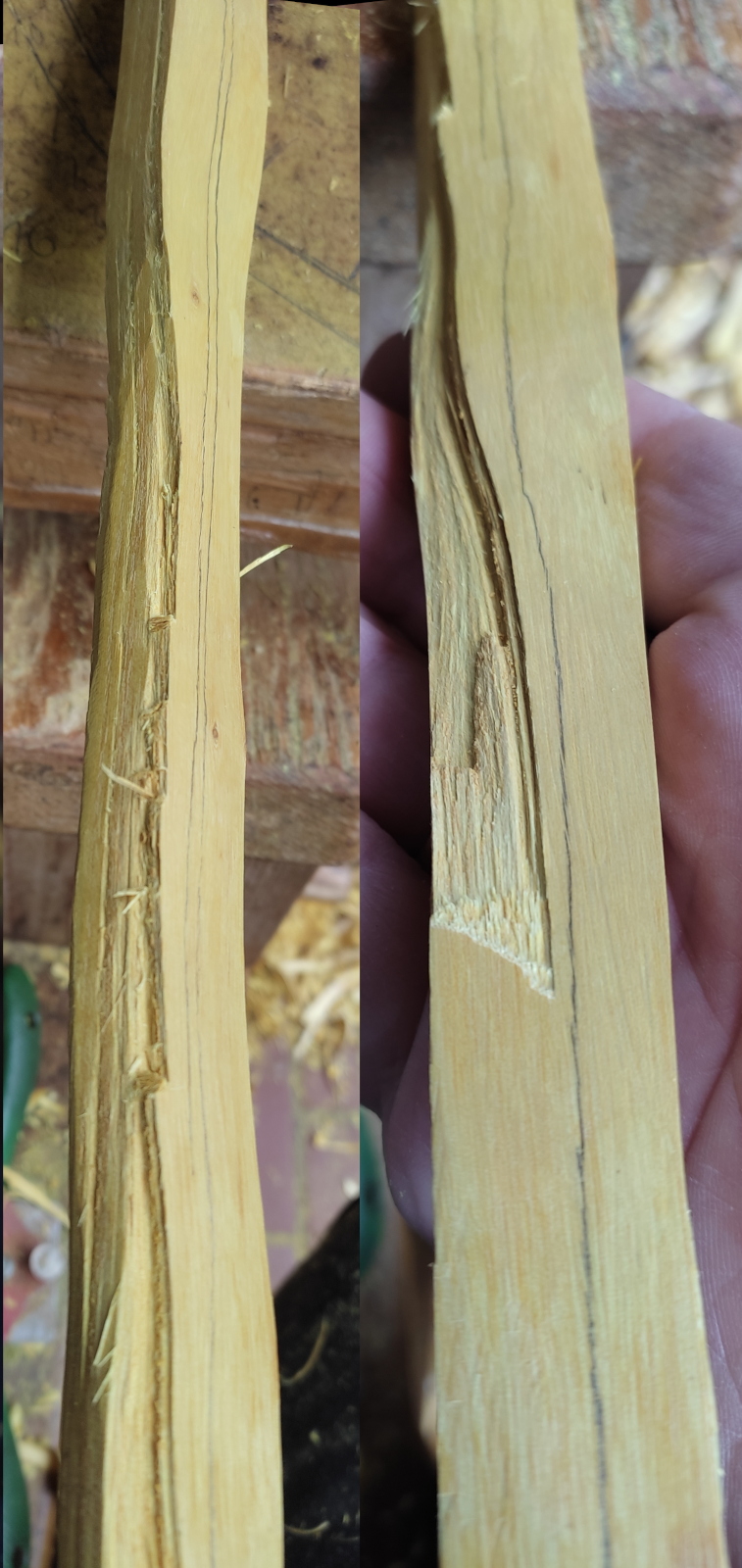 Der Faserverlauf sollte nicht so quer im Wurfarm gehen, immerhin habe ich den Halbstamm ja komplett der Länge nach so gespalten. Und wenn man den Rücken ansieht, gehen die Risse nicht nur entlang der Fasern, sondern auch quer.