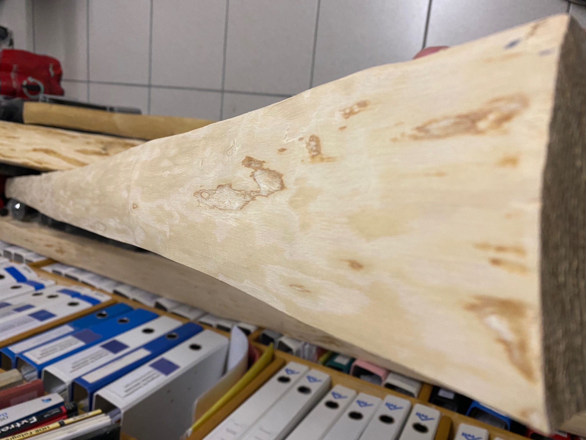 Also aktuell liegt die Dicke, gemessen am künftigen Bogenrücken mittig bei 8-9cm, gemessen mit dem Messband, vom Übergang Rücken-Seite sind es ca 6.5 - 8cm