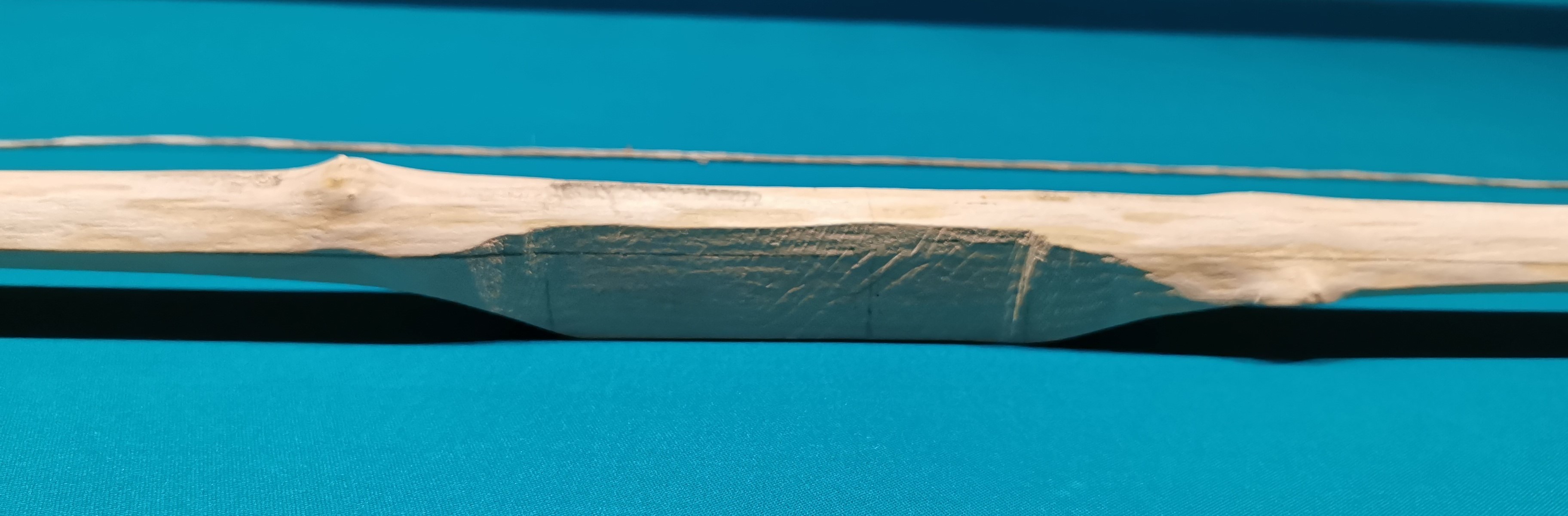 Halte den Bogen mal so, das du die Sehne von dir wegdrückst und du über die eingezeichnete Hilfslinie peilen kannst. Dann siehst du sehr genau, wo es Unstetigkeiten in der Biegung gibt.