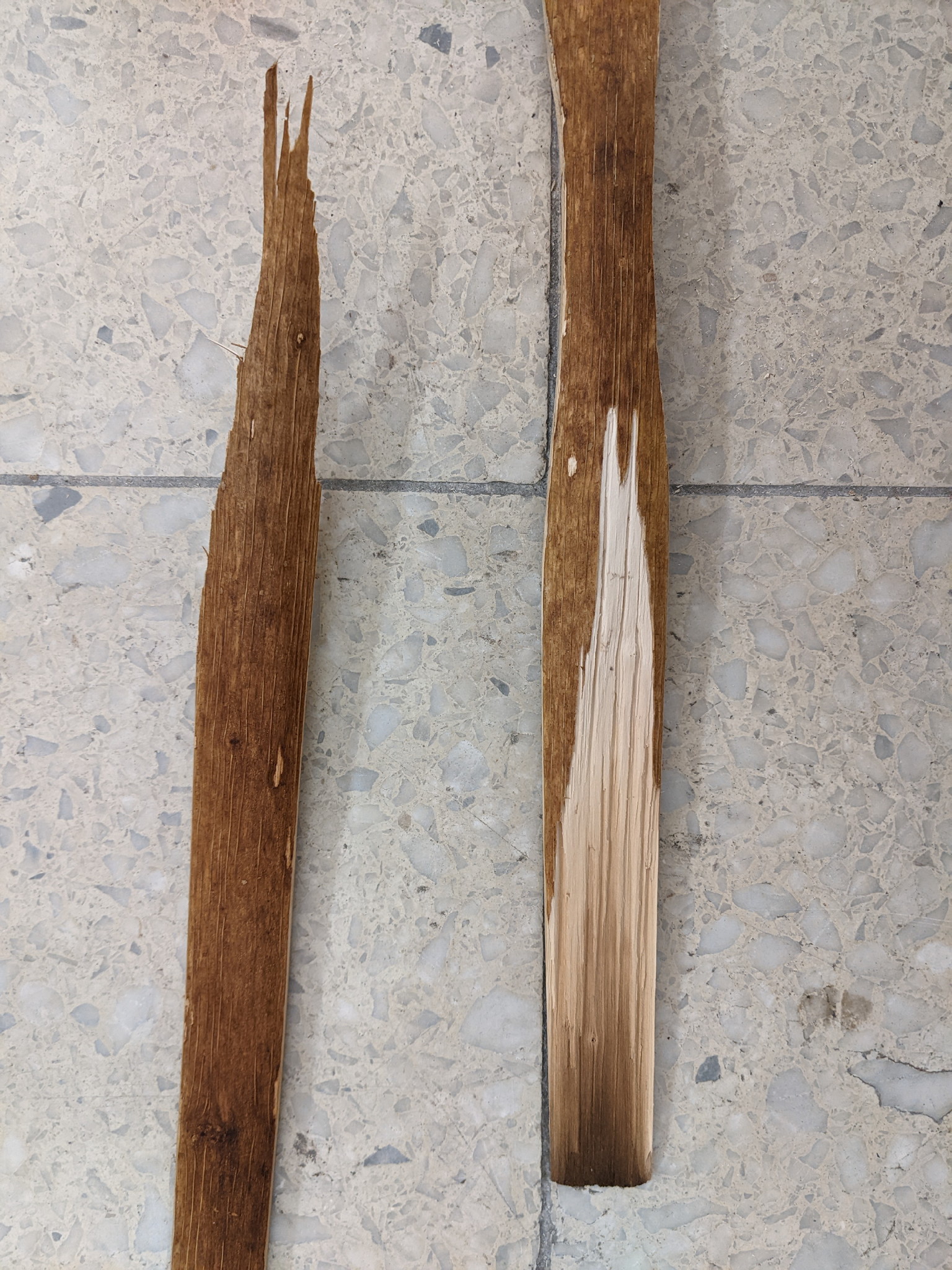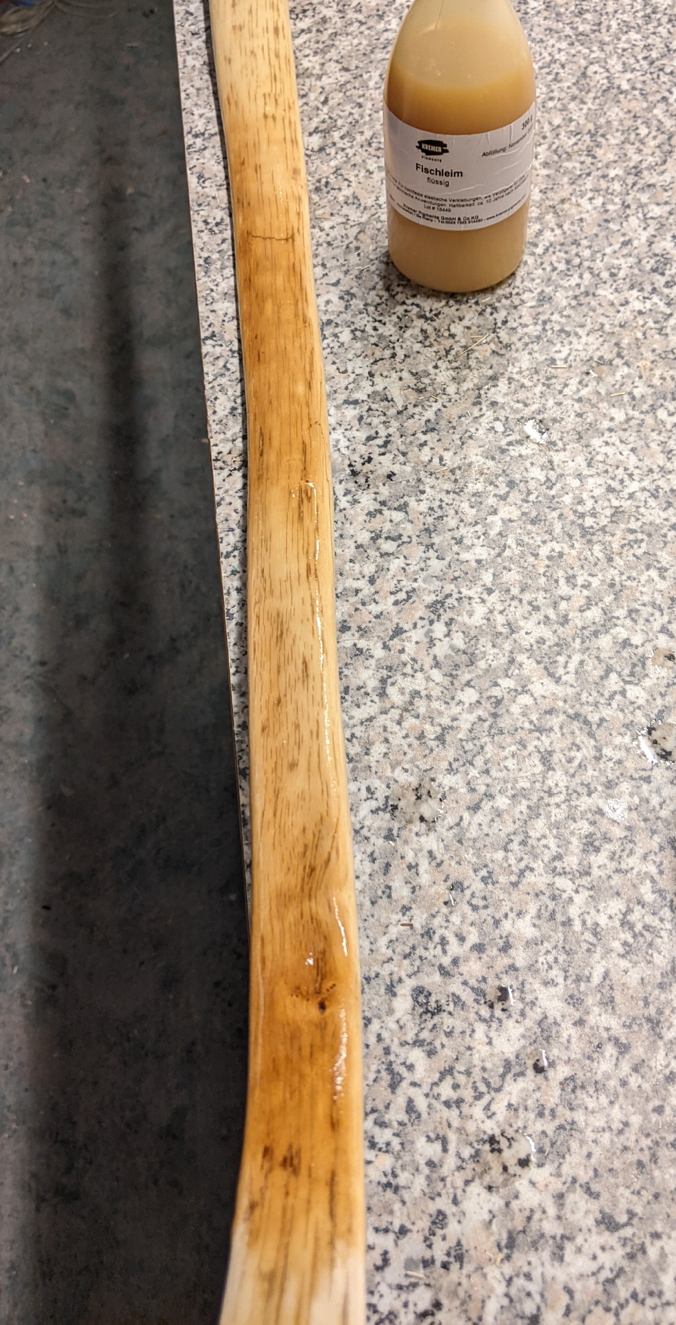 Er ist genau an einer Stelle, wie das letzte Mal glatt gebrochen, die einmal zuviel Hitze abbekommen hat und der Bast auch deutlich dunkler war. Ich hatte deswegen schon über ein Hanf backing nachgedacht, wollte aber wissen ob das als selfbow hält, wenn das Haselholz 4h gegrillt wird.