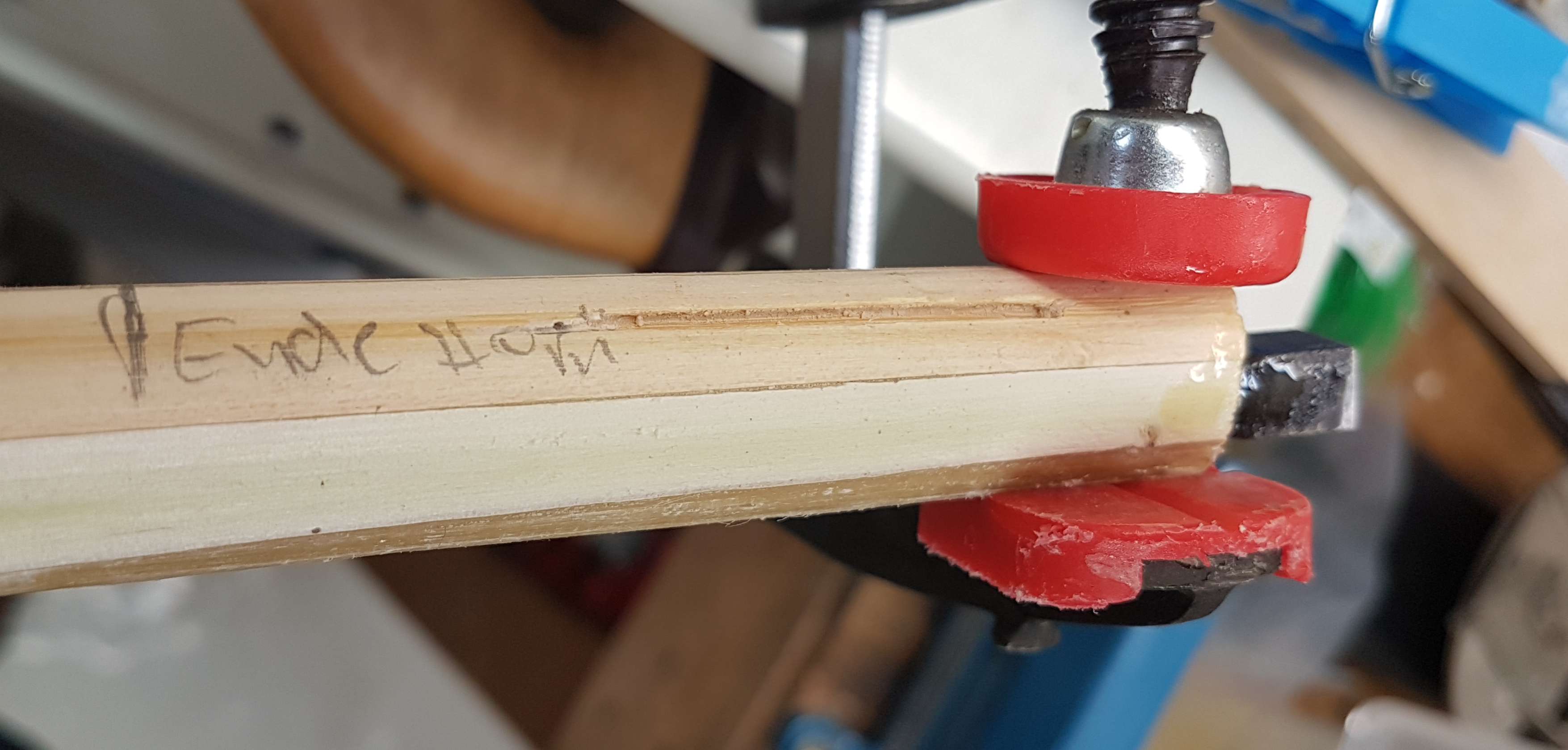 Bevor ich anfing nachzudenken, hatte ich weiter Holz abgetragen, schonmal an Stellen an denen kein Holz mehr abgetragen wird Unebenheiten weggeschliffen und jetzt mal geschaut was ich da verbrochen habe. Tiller ist fast fertig, an zwei Stellen noch ein bischen Holz abtragen und dann gibt es volle Standhöhe. Die WA-Enden sind jetzt bei ca. B 13 x H 18 mm, die Mitte bei ca. B 36,5 x H 36 mm.