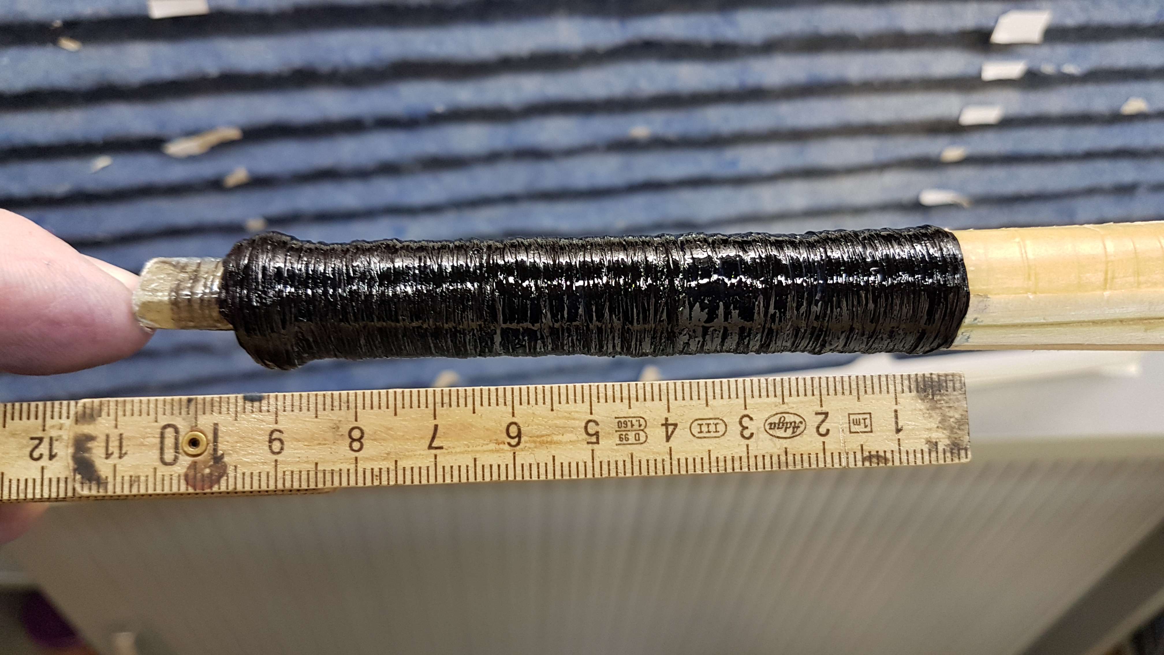 Heute habe ich überschüssigen Kleber vom Rücken entfernt (von der Sehnenlage und neben der Lage) und mehrere Lücken direkt neben dem Sehnenbelag mit trockener Sehne gefüllt. Immerhin 10 g unnötige Masse entfernt. Der Bogen hat aktuell 730 g.