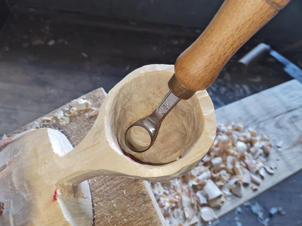 Hab dann gleich erstmal 'ne Kuksa drauf gebaut und mein kurz zuvor fertiggestelltes 19er Löffelmesser ausprobiert.