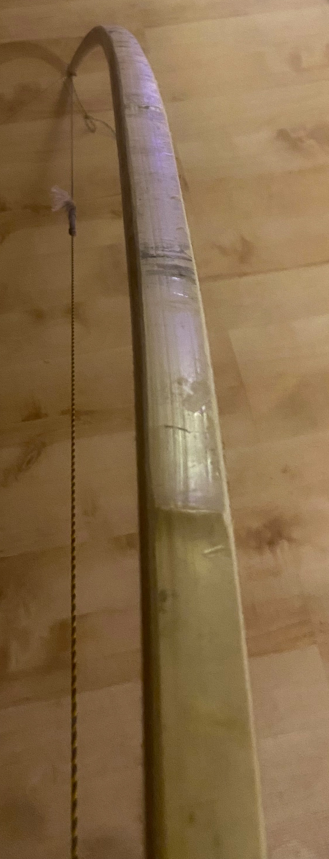 Aber, bedingt durch den Schlenker beim Bambus-Kleben, ist ein Wurfarm nicht ganz gerade. Auf Standhöhe kippt dadurch der gesamte Bogen ein Stückchen zur Seite. Er rollt quasi um ein paar Grad über den Rücken, und zwar so viel, dass ich nicht denke, dass es eine rein optische Angelegenheit ist. Das Problem geht vom schiefen Wurfarm aus und nimmt im Bogenverlauf nach und nach ab.