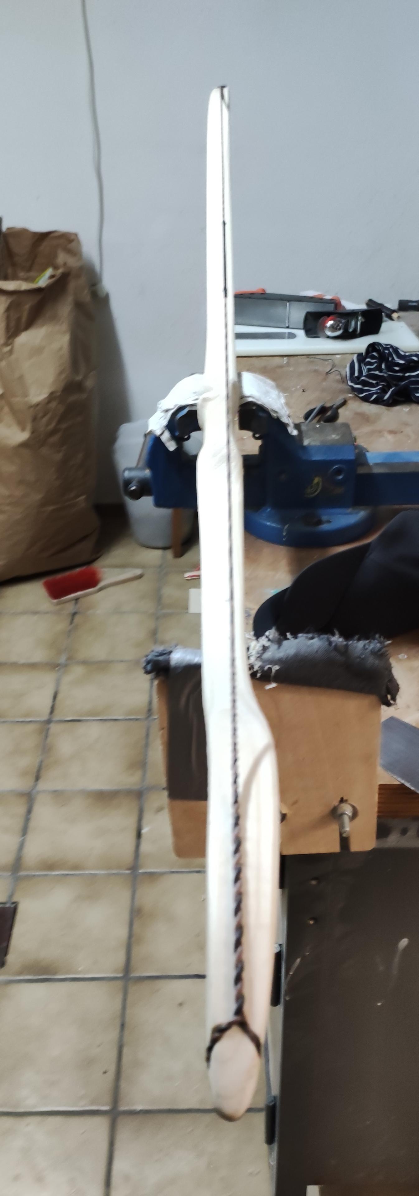 Anbei ein paar Bilder des letzten Projektes. Bei diesem Eschenbogen mit Leinenbacking musste ich noch ordentlich nachtillern und habe dabei auch versucht die Verdrehung raus zu bekommen. Leider ohne Erfolg und großem Verlust an Zuggewicht. Meinem Verständnis nach, müsste ich bei einer Verdrehung nach links, auf der rechten Seite etwas wegnehmen, damit der Biegeradius hier kleiner wird. Richtig?
