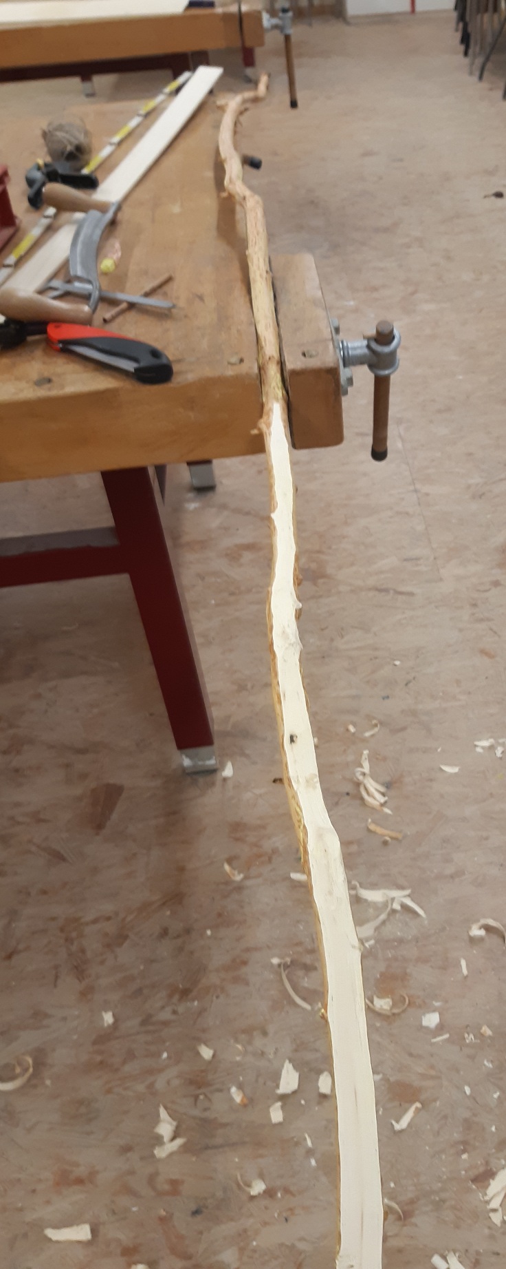Die Quitte hatte ich gestern in der Arbeit dabei und habe nach Feierabend mal grob die sehnenlage überprüft und auf der dicken Seite etwas Holz abgetragen. Anschließend noch mal mit Holzleim nachbehandelt.